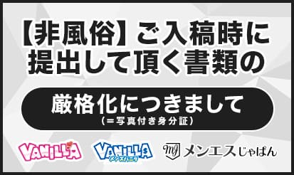 【バニラ・メンズバニラ・メンエスじゃぱん】ご入稿時に提出して頂く書...バニラ・メンズバニラ・メンエスじゃぱんより、ご入稿時に提出して頂く書類の厳格化についてのお知らせです。概要この度、ご入稿時に提出いただく書類について、審査基準の厳格化となりましたのでご案内いたします。(非風俗ジャンル) ◇バニラ・メンズバニラ◇メンエスじゃぱん 上記媒体において、届出書が不要な非風俗ジャンルのうち、個人経営の場合は「写真付き身分証明書+誓約書」の提出が必要です。...