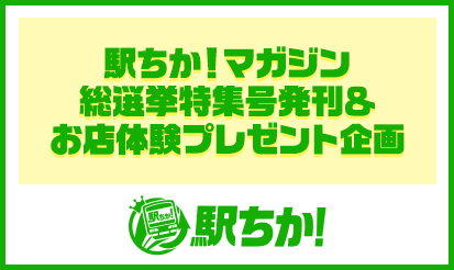 *駅ちかより、駅ちか!マガジン総選挙特集号発刊&お店体験プレゼント企画のお知らせです。 概要昨年末に終了したミス駅ちか総選挙にて上位入賞を飾った女の子のグラビアや協賛いただいた店舗様の紹介などを掲載したフリーペーパー「駅ちか! マガジン 総選挙特集号」を発刊いたします。 ▼詳細発行日:4月15日(水)発行形式:フリーペーパー+デジタルブック ※駅ちかでもweb公開予定配布形式:北...