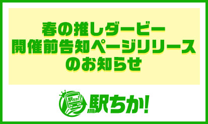 【駅ちか】春の推しダービー 開催前告知ページリリースのお知らせ駅ちかより、春の推しダービー 開催前告知ページリリースのお知らせ 概要★☆★リリースの告知☆★☆ 【駅ちか!春の推しダービー】開催前の告知ページをリリース致しました! ★☆★☆★☆★☆★☆★☆★ ▼風俗版はこちらをご確認ください。 ▼メンエス版はこちらをご確認ください。 ━━━━━━━━━━━━━駅ちか!春の推しダービーとは?━━━━━━...