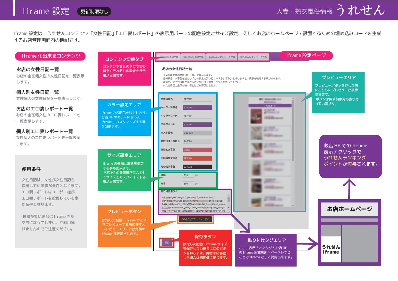 「女性日記」「エロ妻レポート」のインラインフレーム設定機能が追加となりました!店舗様管理画面にて、表示用パーツの配色・サイズの設定と、店舗様のオフィシャルホームページに設置するための埋め込みコードの作成ができる機能となっております。