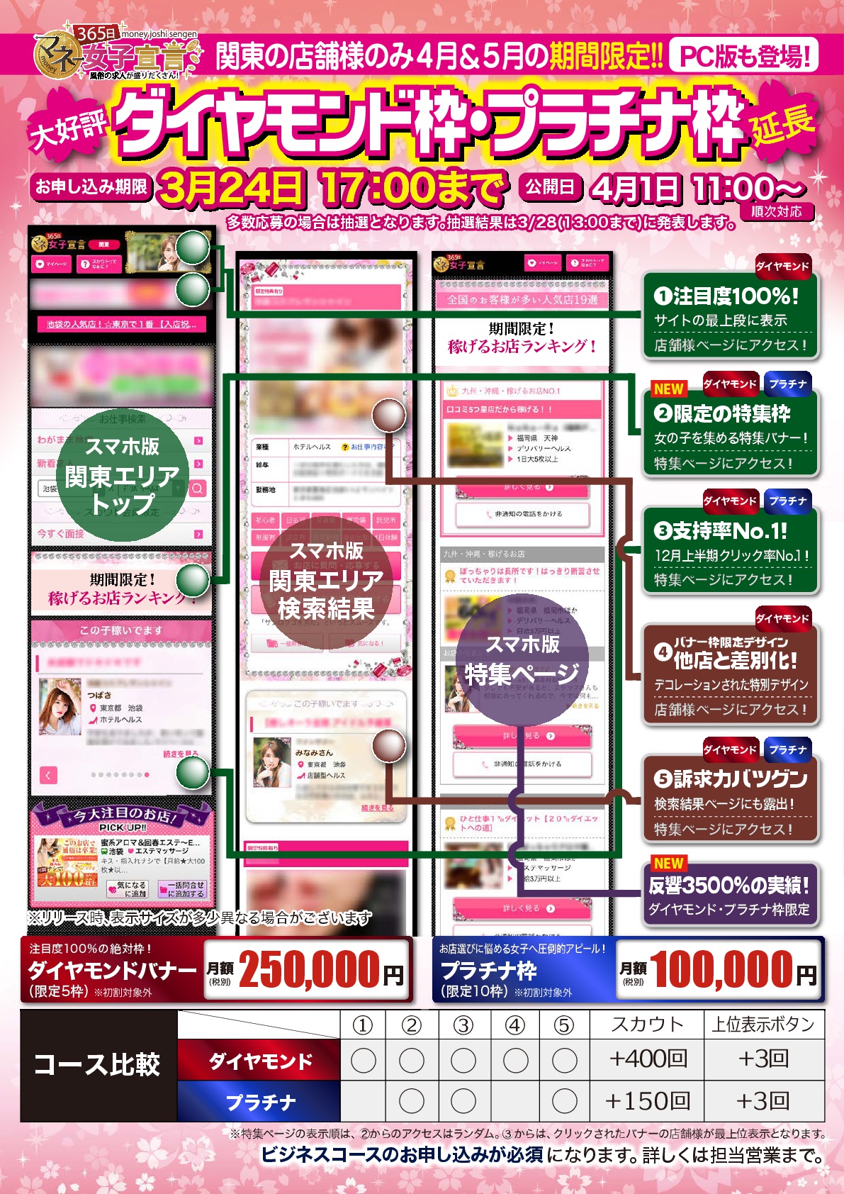 2月・3月に関東の店舗様のみ期間限定で行っておりました「ダイヤモンド・プラチナ」枠ですが、大人気の「スマホプレミアム以上」の反響があり、4月・5月は更にパワーアップして、限定枠の掲載期間延長となりました!