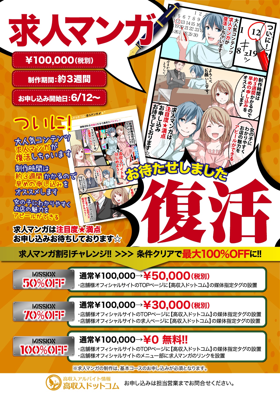 【高収入ドットコム】満を持して復活!!「求人マンガ」最大100%OFF!