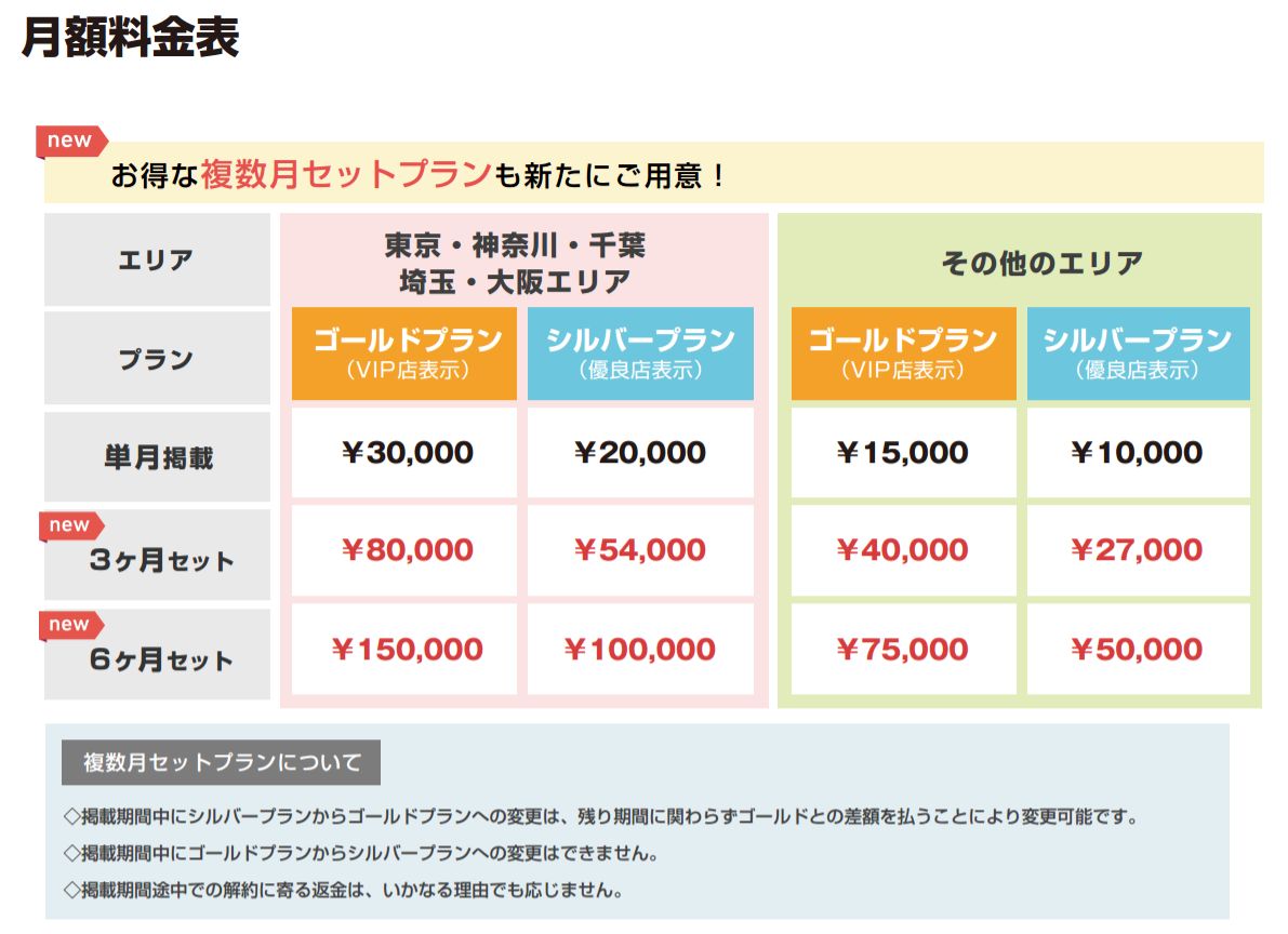 | ゴールドプラン | 30,000円/3ヶ月掲載 | 30,000円/2ヶ月掲載 | 30,000円/2ヶ月掲載 | 30,000円/単月掲載 |