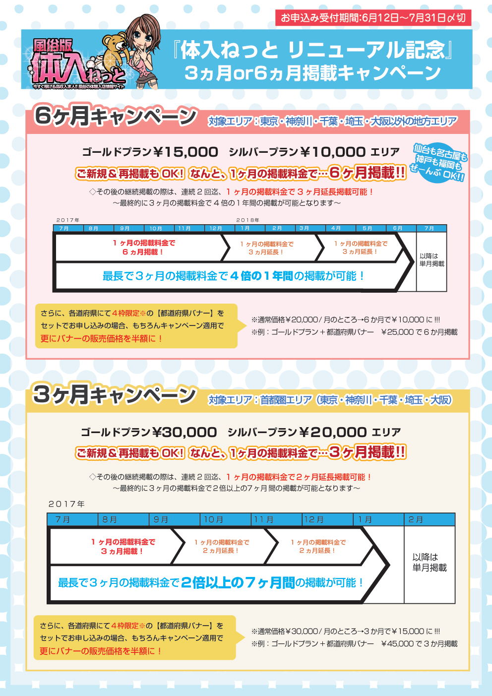 7月31日(月)までに有料掲載をスタートすると、1ヶ月分の掲載料金で6ヵ月間の掲載が可能となっております!