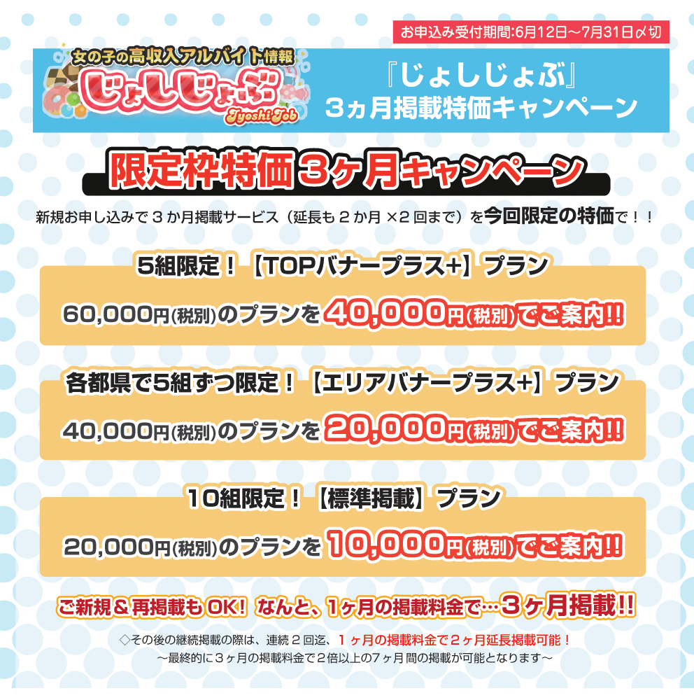 7月31日(月)までに有料掲載をスタートすると、1ヶ月分の掲載料金で3ヵ月間の掲載が可能となっております!