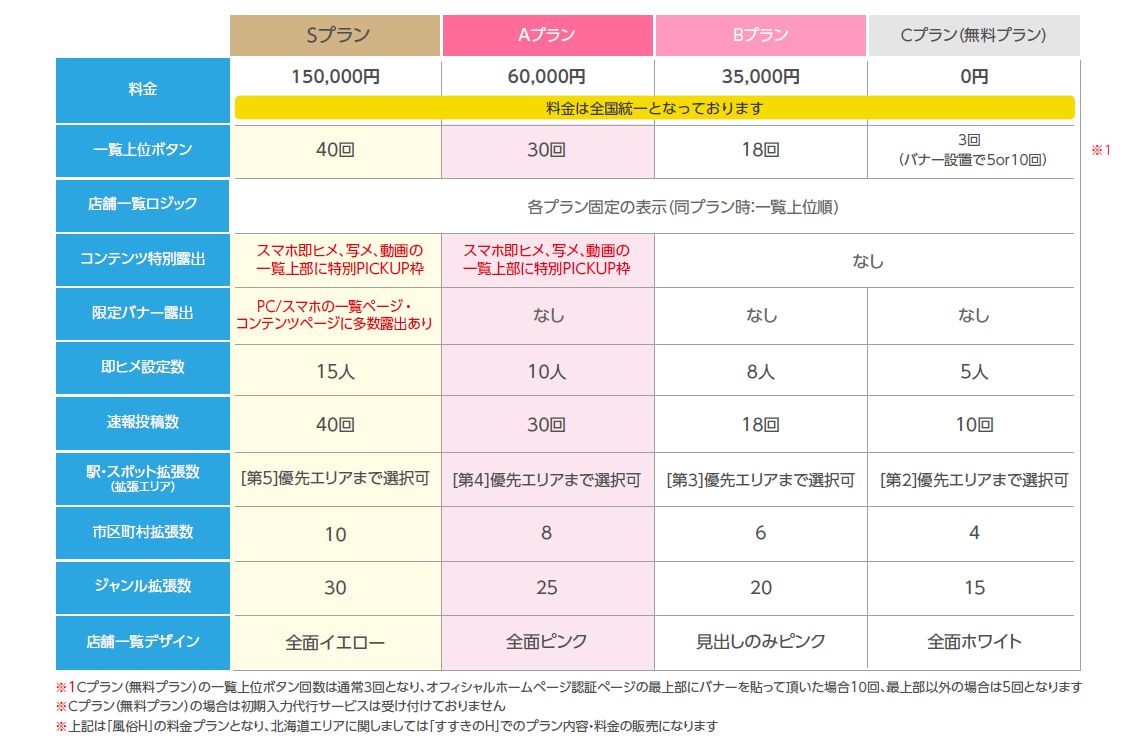 | Sプラン | Aプラン | Bプラン | Cプラン (無料プラン) |