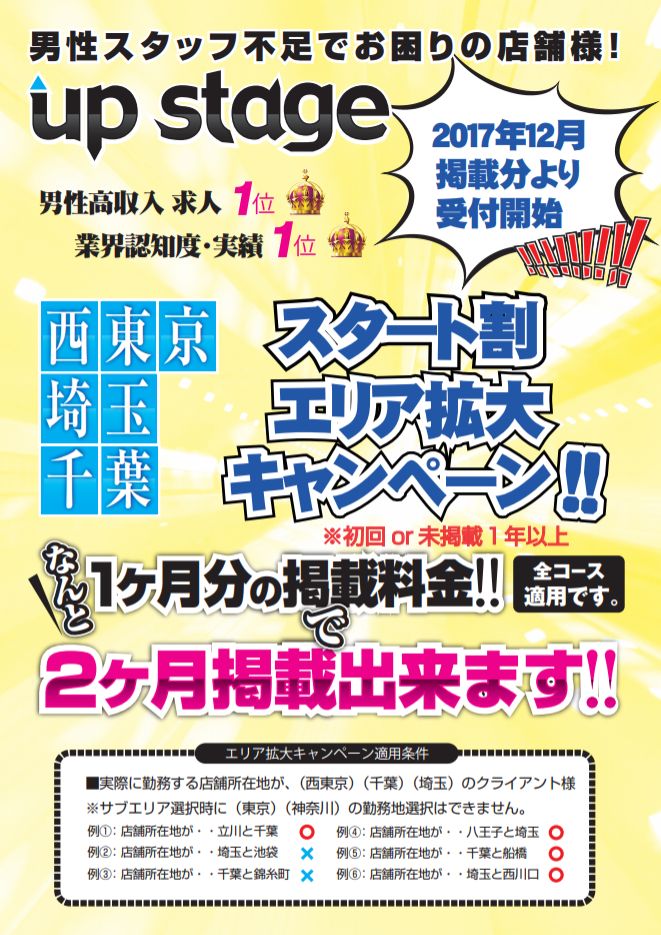 男性求人で勢いを伸ばし続けている、アップステージより、スタート割キャンペーンのエリア拡大のお知らせです。