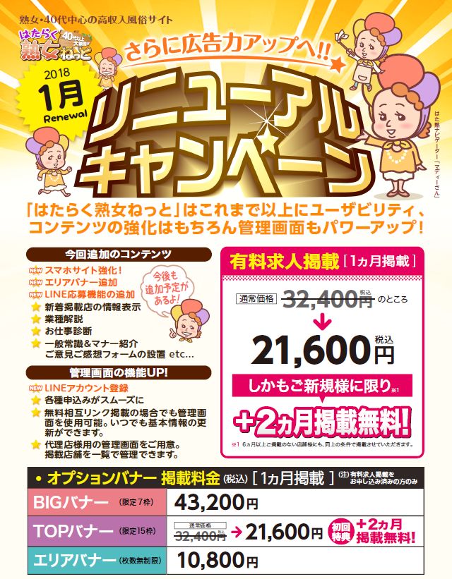 大好評のリニューアルキャンペーンは現在も実施中になります!新オプションとご一緒に、パワーアップするはたらく熟女ねっとへお得にご掲載されてみてはいかがでしょうか?
