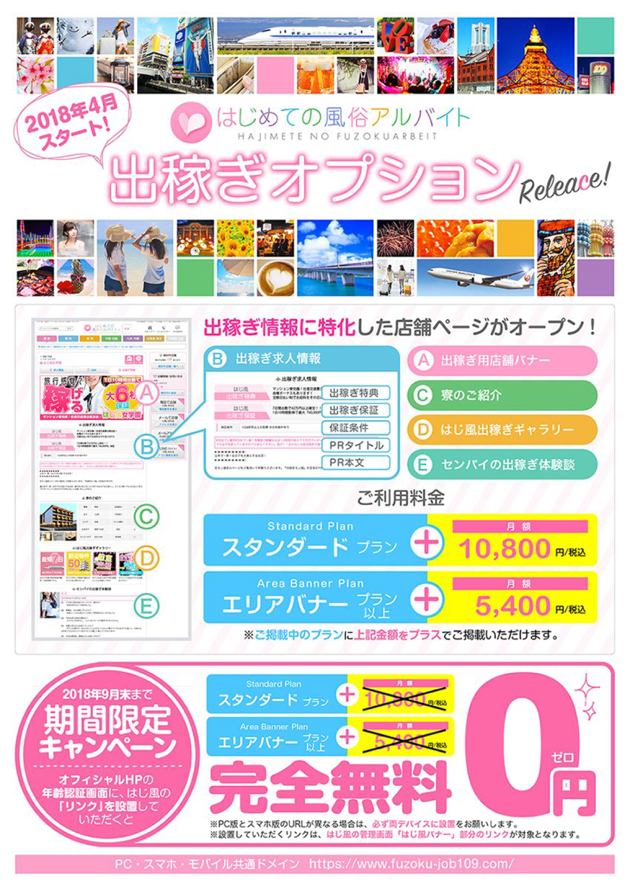 2018年9月末まで、オフィシャルHPの年齢認証ページにはじめての風俗アルバイトのリンクバナー設置で無料で出稼ぎオプションが掲載可能となっております!