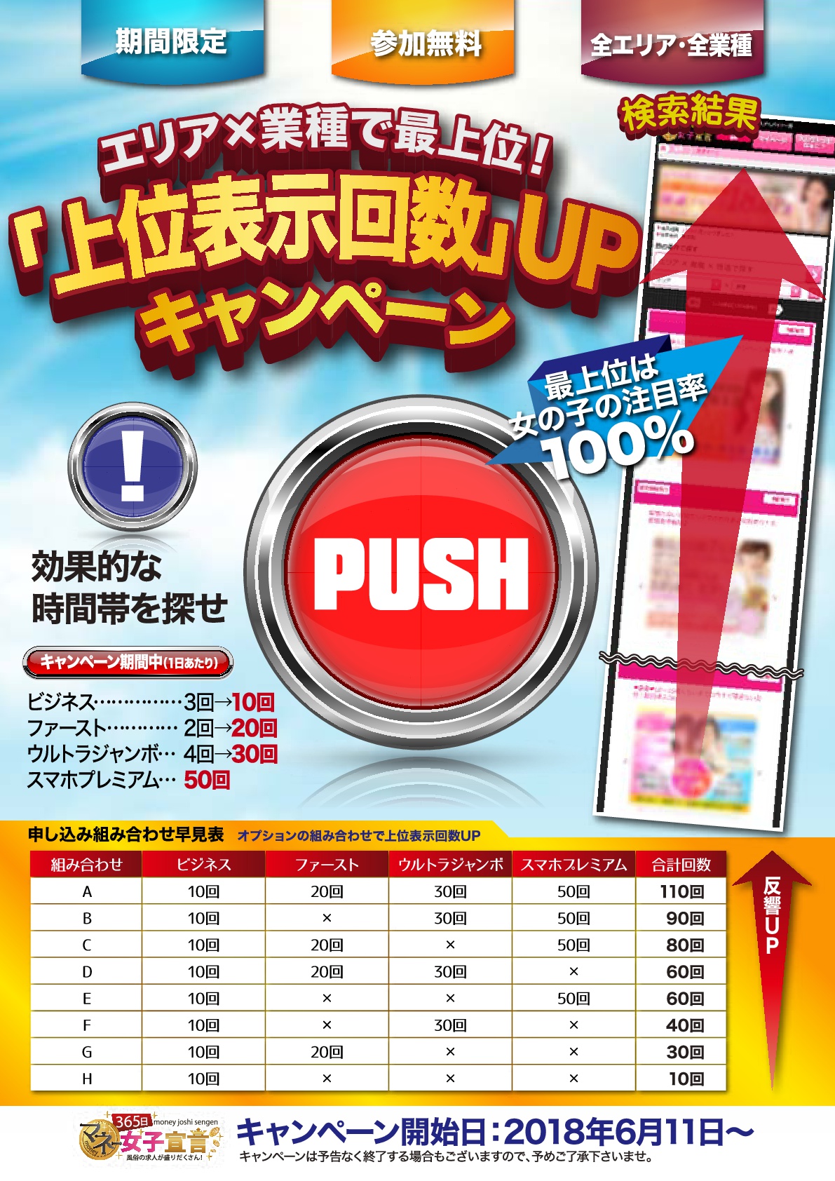 オプションプランをお申込み頂くと上位表示回数もアップとなり、全オプションで最大110回の上位表示が出来ます!