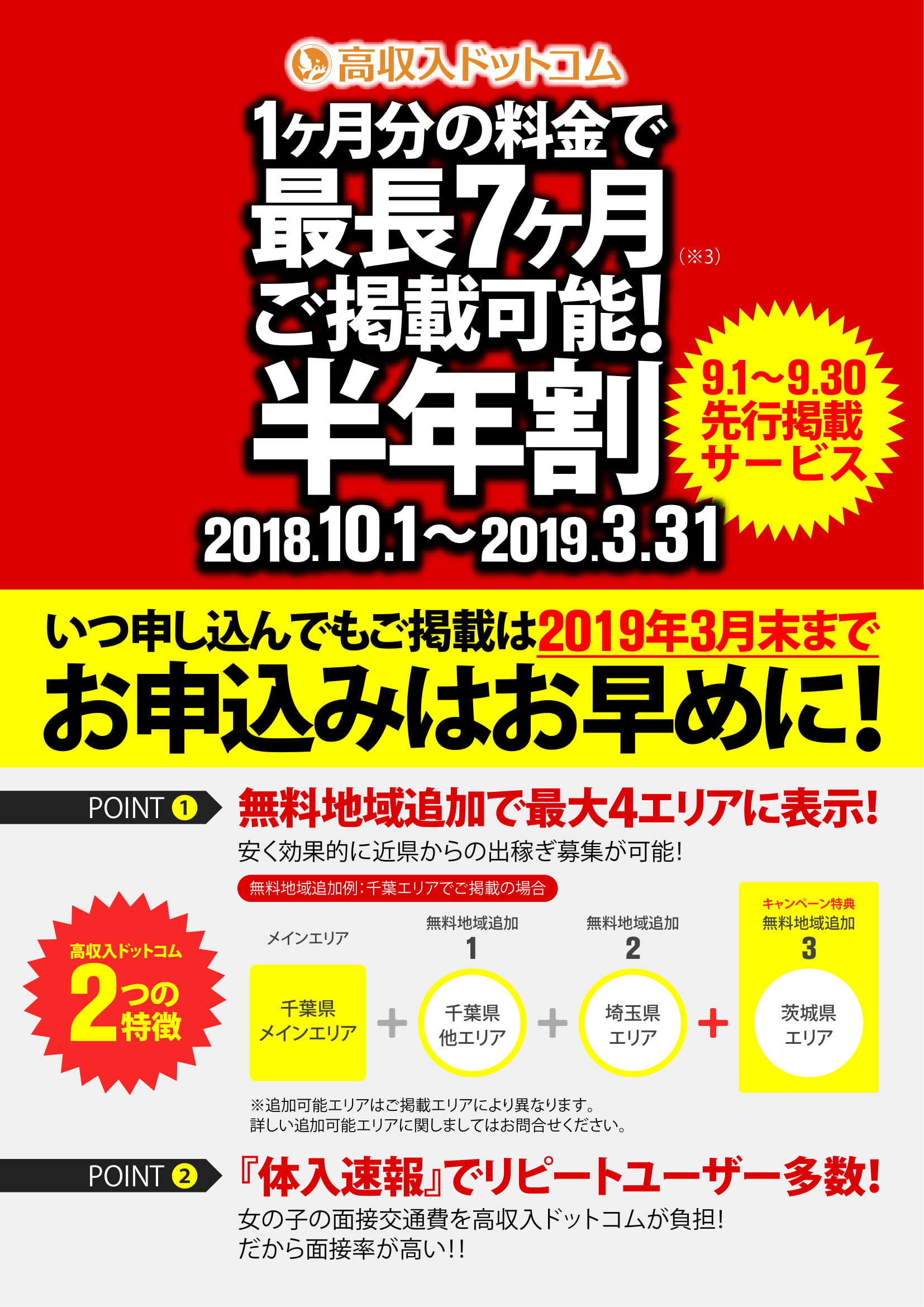 - ご掲載開始から半年ではなく、いつお申込みして頂いても【2019年3月31日】までのご契約となります。