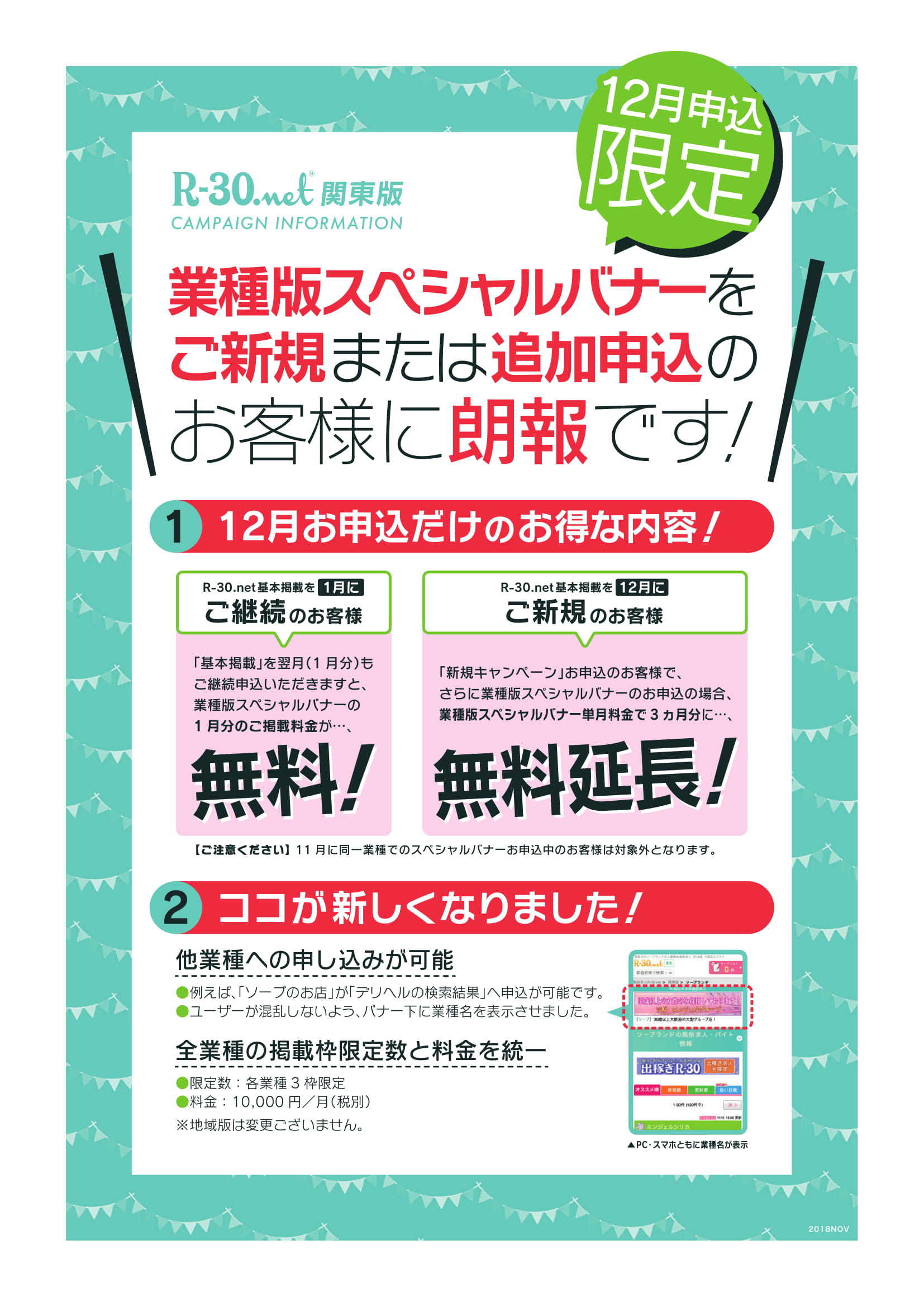 - 基本掲載を2019年1月もご継続いただければ業種版スペシャルバナーを1月無料掲載可能です。