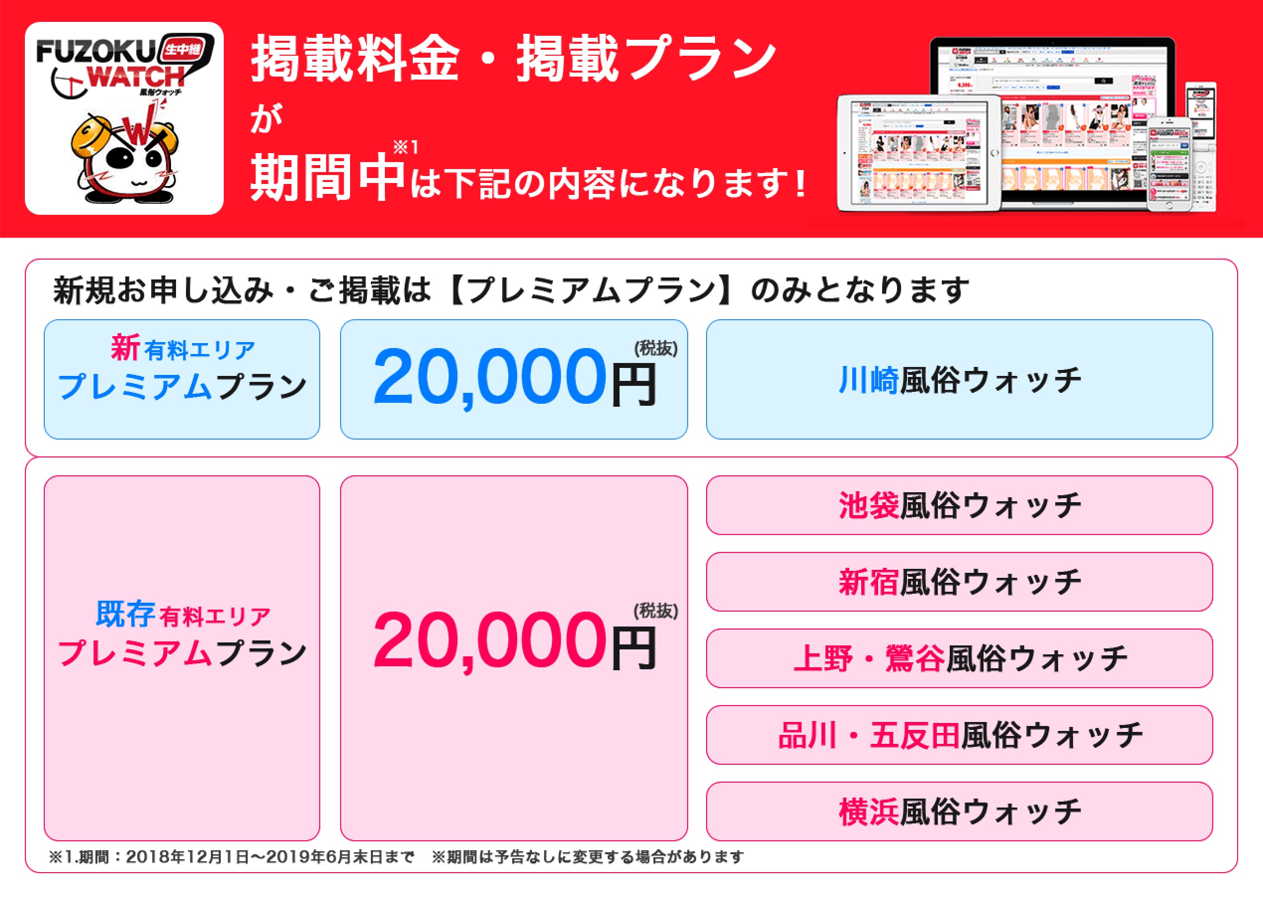 リアルタイムな出勤表に特化した「風俗ウォッチ」より、2018年12月~の川崎エリア有料化と一部エリアの料金変更のお知らせです!