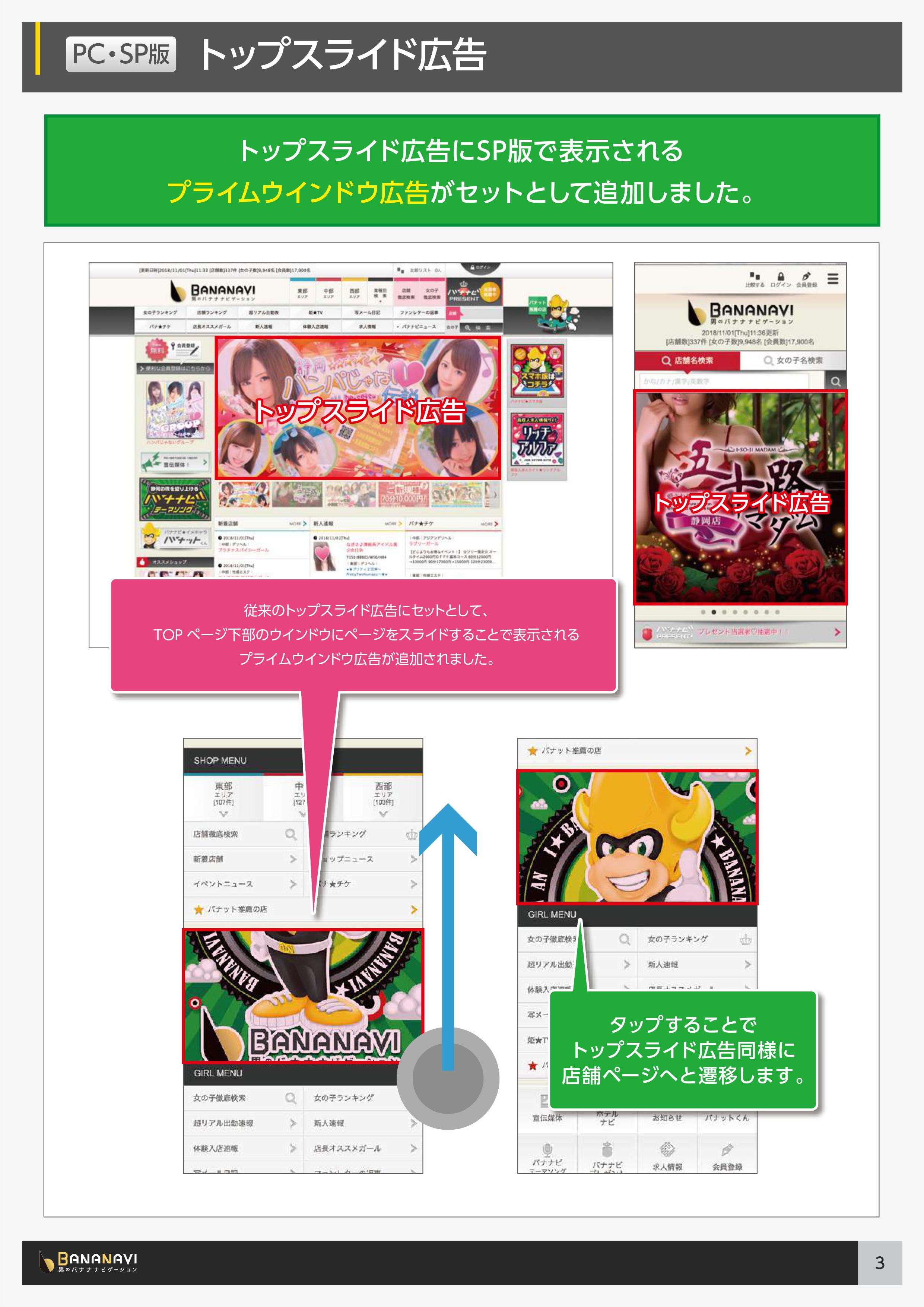 - トップスライド広告(限定15枠)にお申込みをいただくと、スマホ版でTOPページ下部のウインドウにページをスライドすることで、表示がされるプライムウインドウ広告がセットとして追加されました。