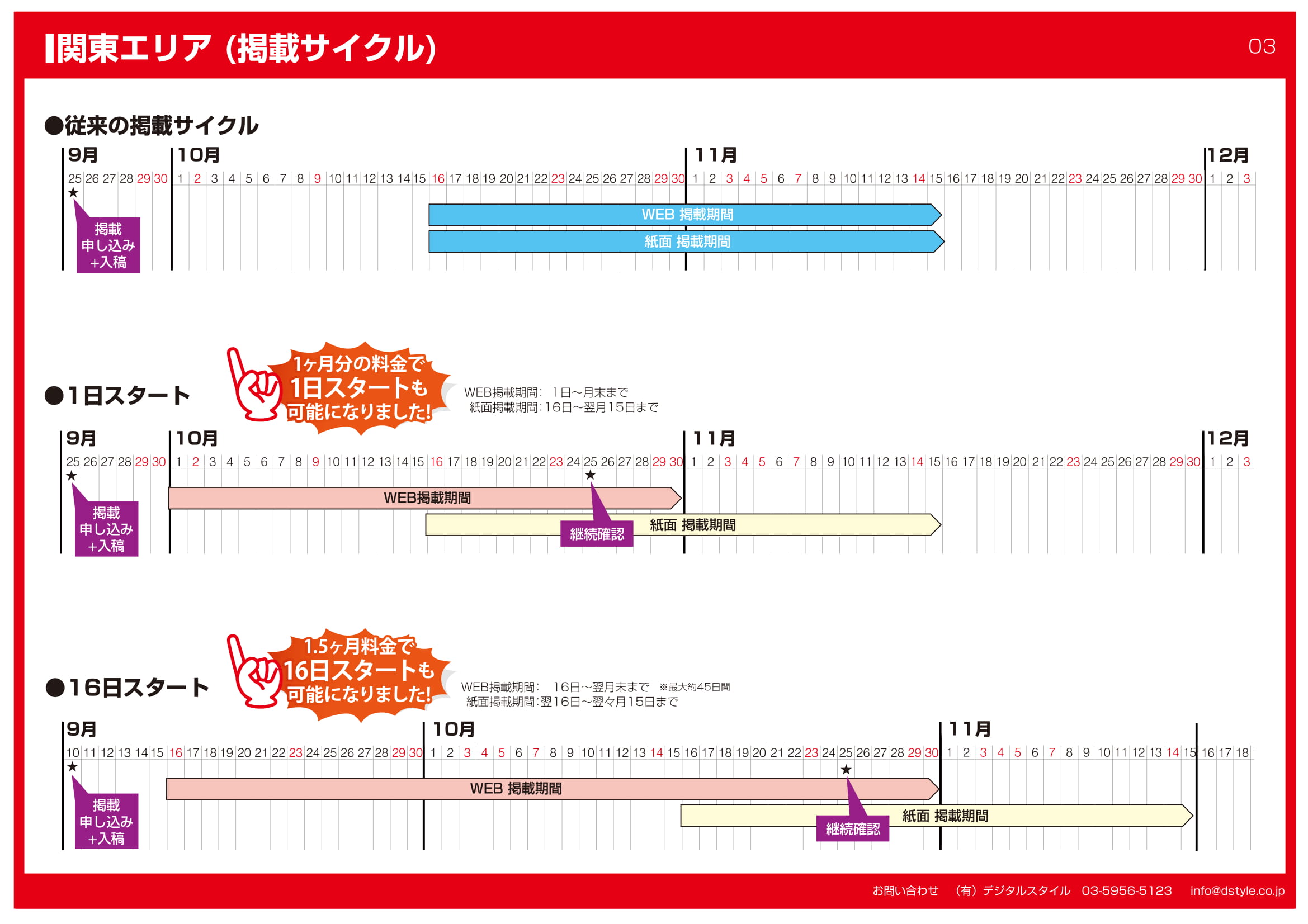 従来は雑誌の締切日や発行日に合わせてのWEBお申込・掲載となっておりましたが、今後は締切日・発行日を気にすることなくWEB版をクイックに掲載することが可能となりました。もちろん、従来通りの16日~スタートでの掲載も可能となります。