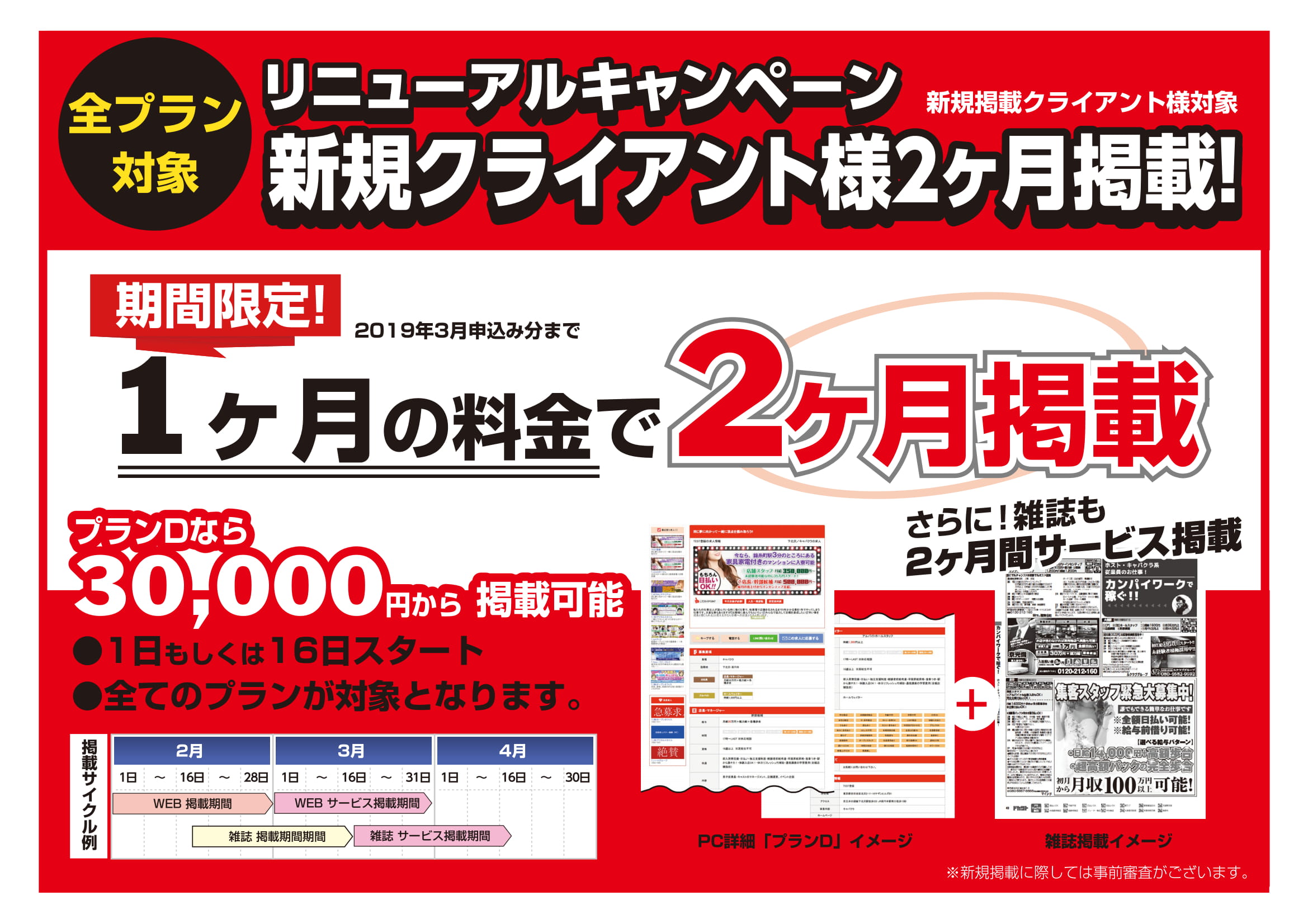 2019年3月申し込み分であれば、1ヶ月料金で2ヶ月掲載が可能となっております!