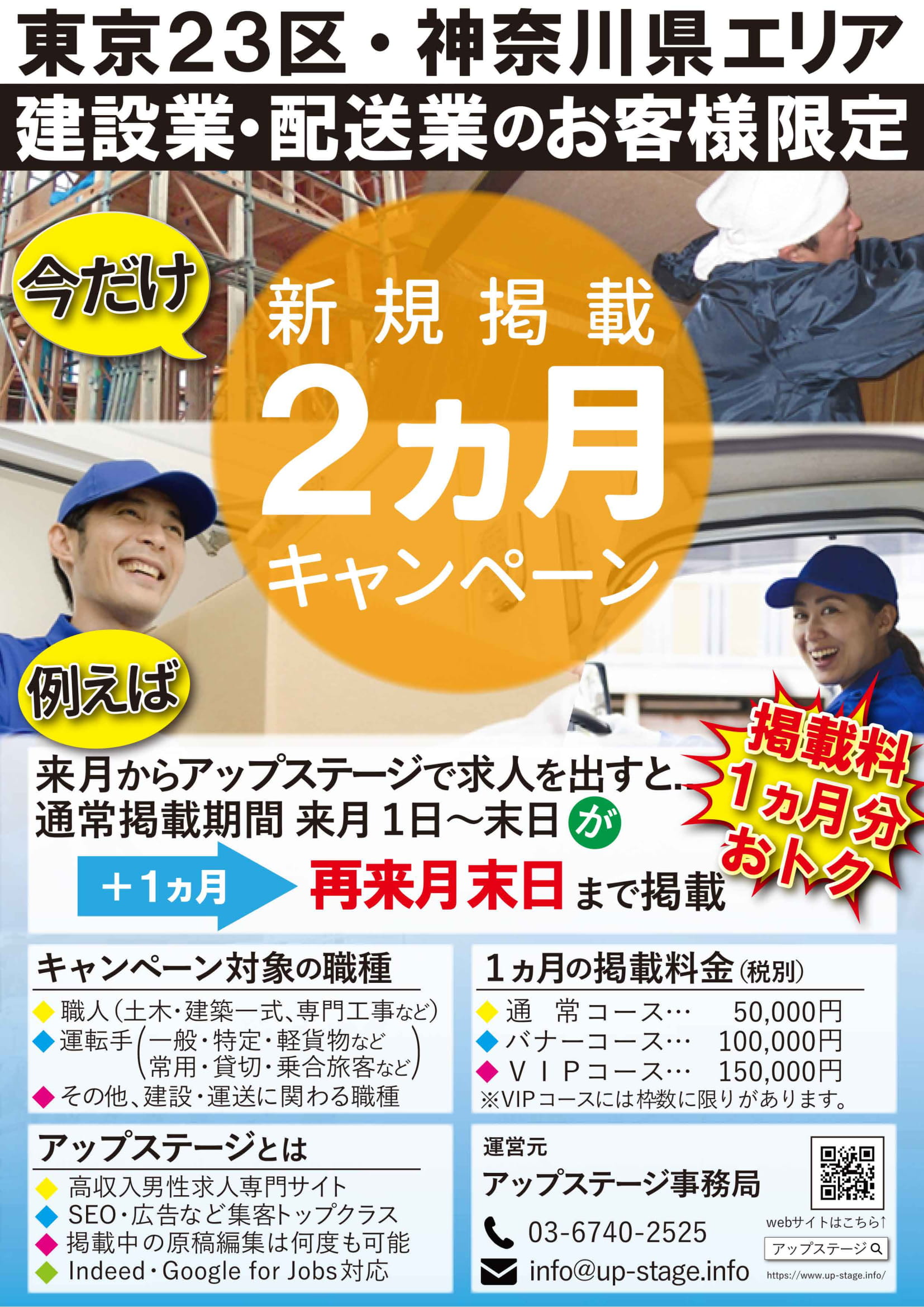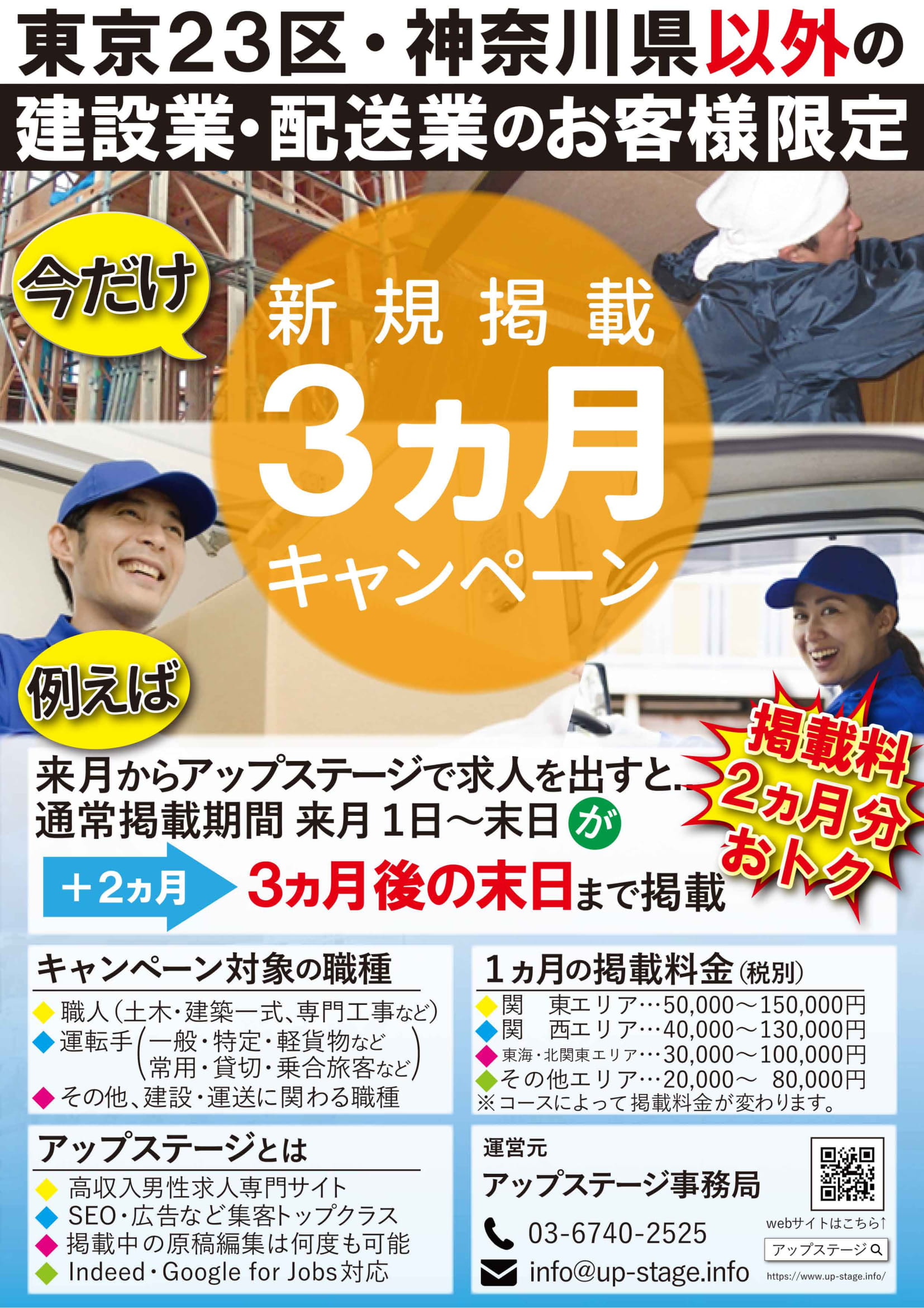 2019年3月1日より建設業と配送業の求人をご掲載希望の店舗様限定で「初回2ヶ月掲載」もしくは「初回3ヶ月掲載」キャンペーンを実施します。(※終了期間未定)