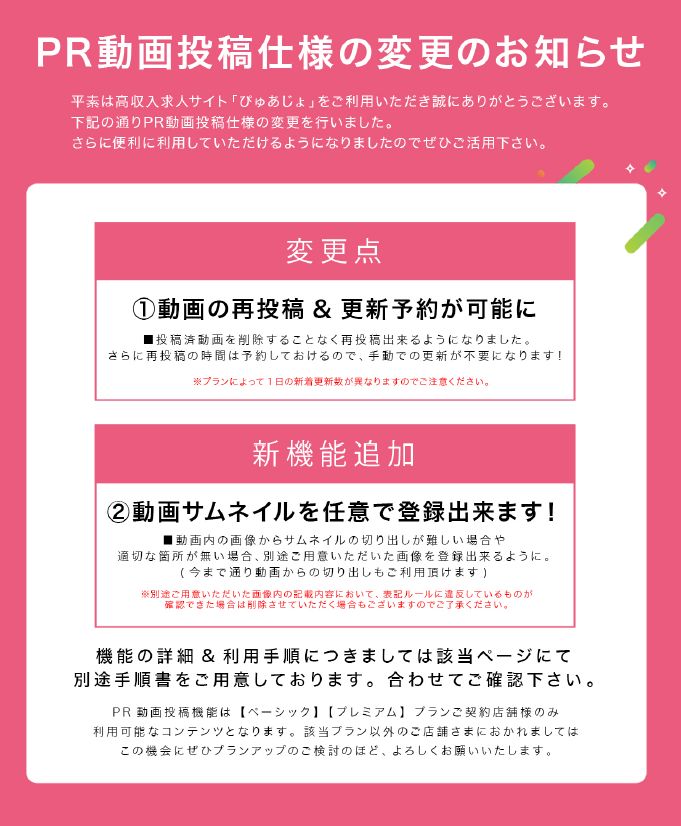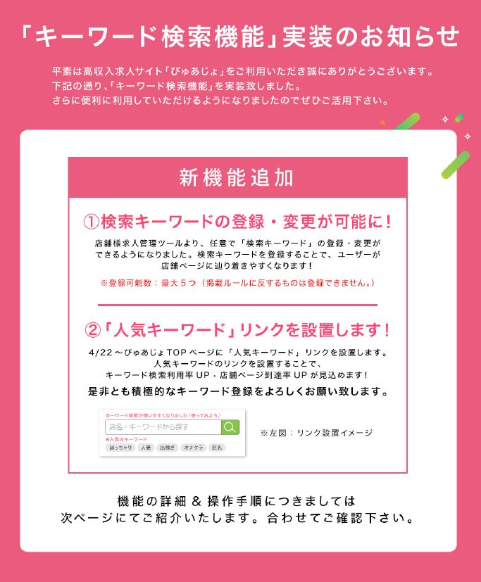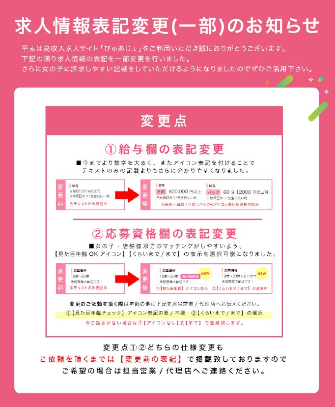 大人気!ぴゅあらばの求人サイトぴゅあじょ より、新機能の追加と、一部仕様変更を行いましたのでお知らせです!