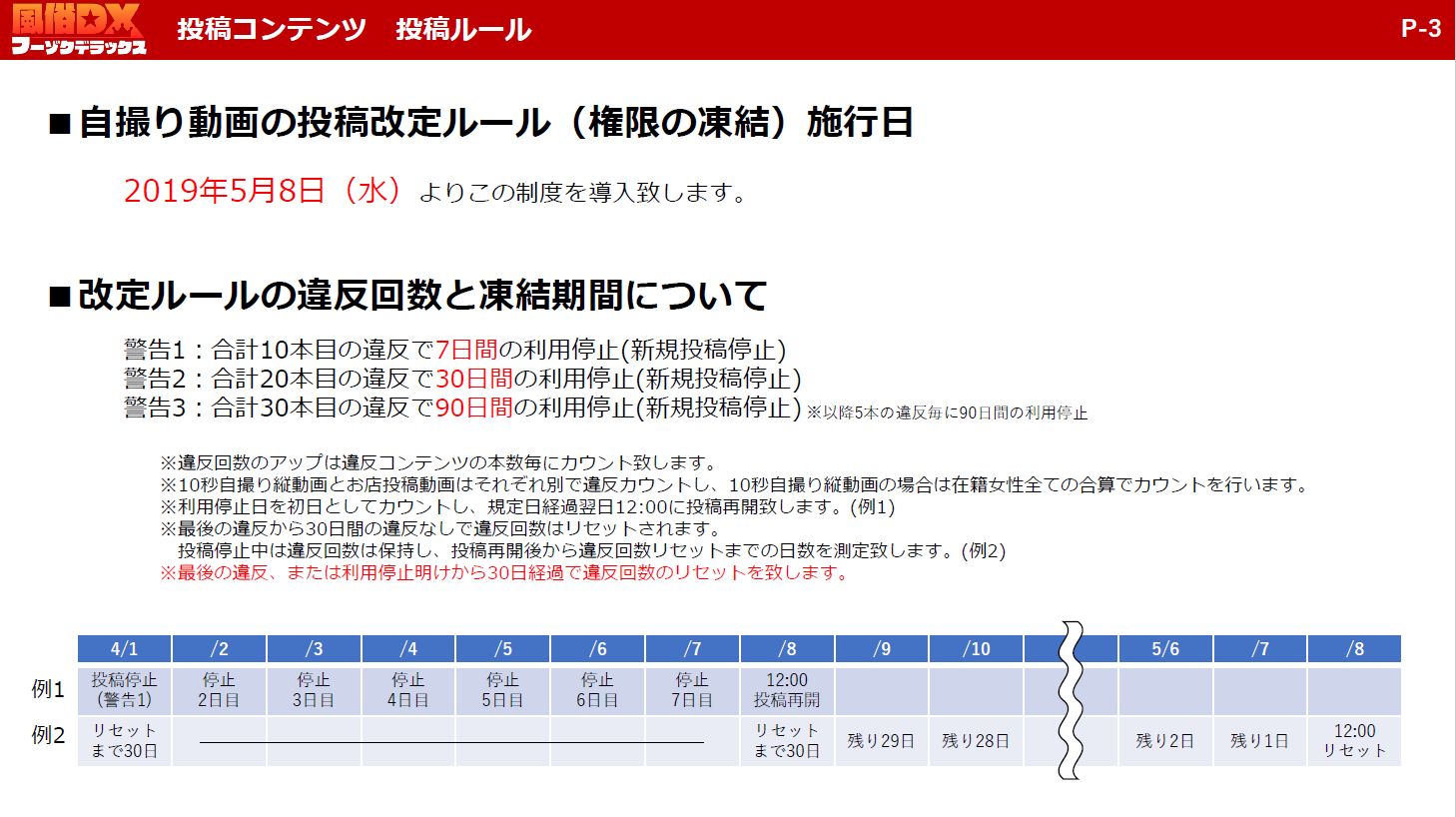 - 最後の違反から30日間の違反なしで違反回数はリセットされますが、投稿停止中は違反回数は保持し、投稿再開後から違反回数リセットまでの日数を測定いたします。(下記資料例2を参照)