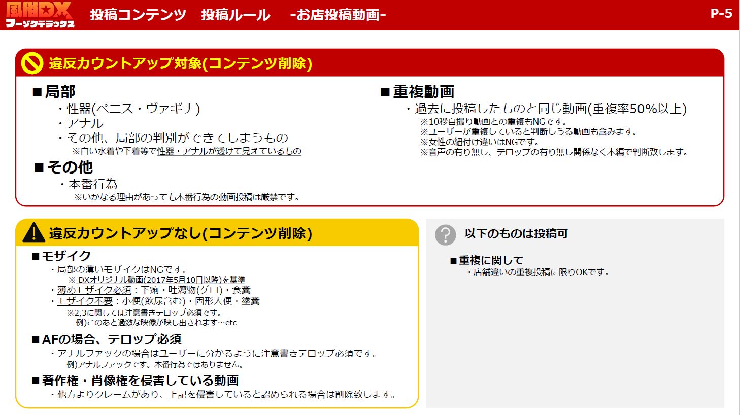 - 10秒自撮り縦動画とお店投稿動画はそれぞれ別で違反カウントを行い、10秒自撮り縦動画の場合は在籍女性全ての合算でカウントを行います。