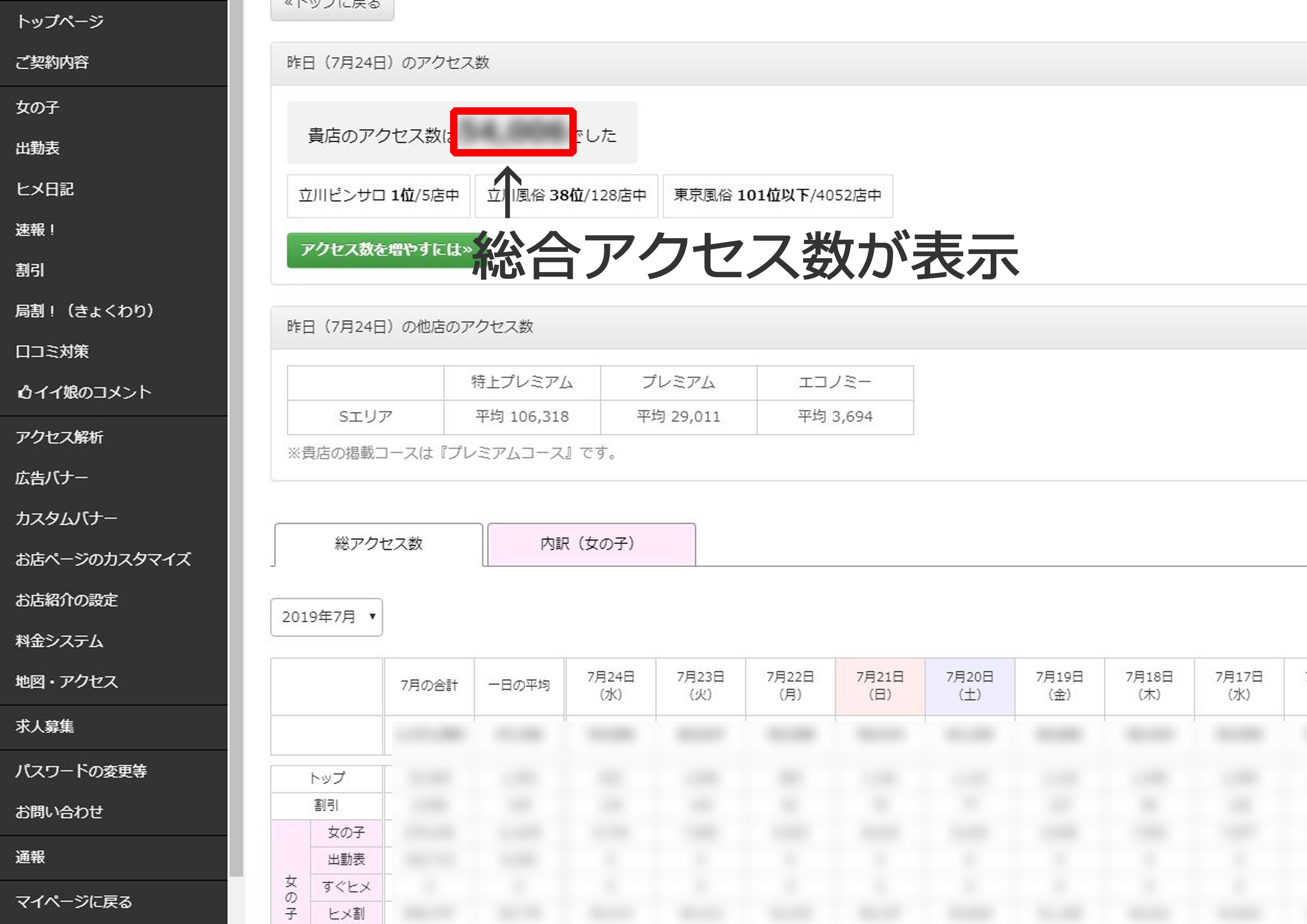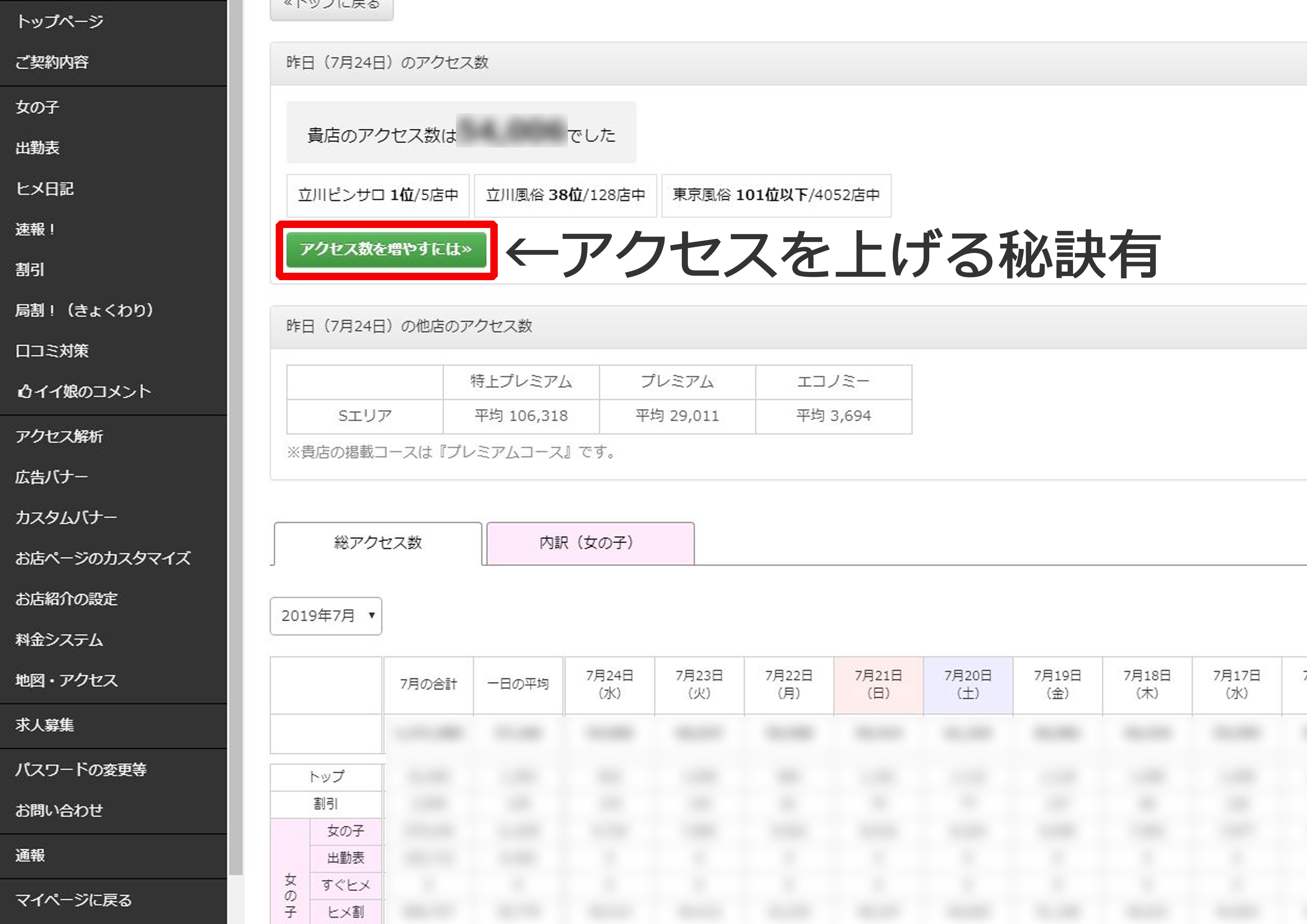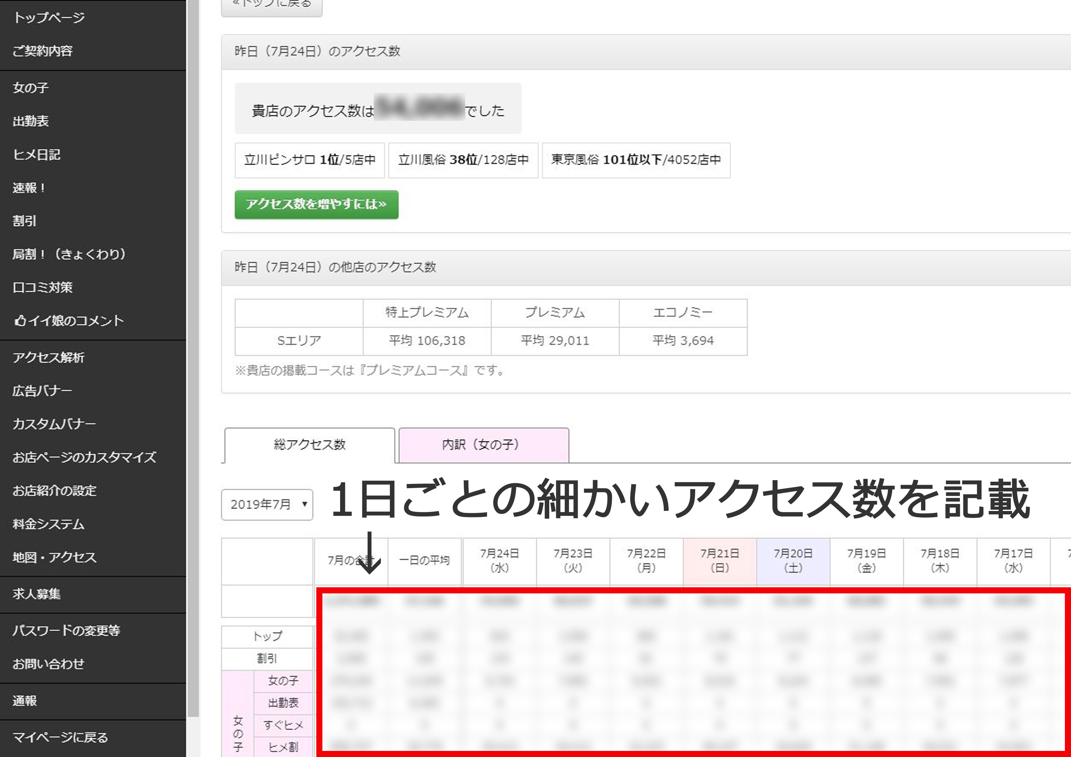 こちらは合計とは別に「トップページ」「割引」「女の子(女の子/出勤表/すぐヒメ/ヒメ割/ヒメ日記/イイ娘)」「口コミ」「速報」「料金システム」「地図・アクセス」のそれぞれのページでのアクセス数が表示されています。
