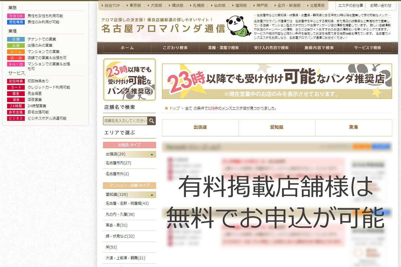 現在、名古屋アロマパンダ通信に有料掲載している店舗様は、オプションの【23時以降受付可能なお店パンダ推奨店】へ無料でのお申込が可能となっています。