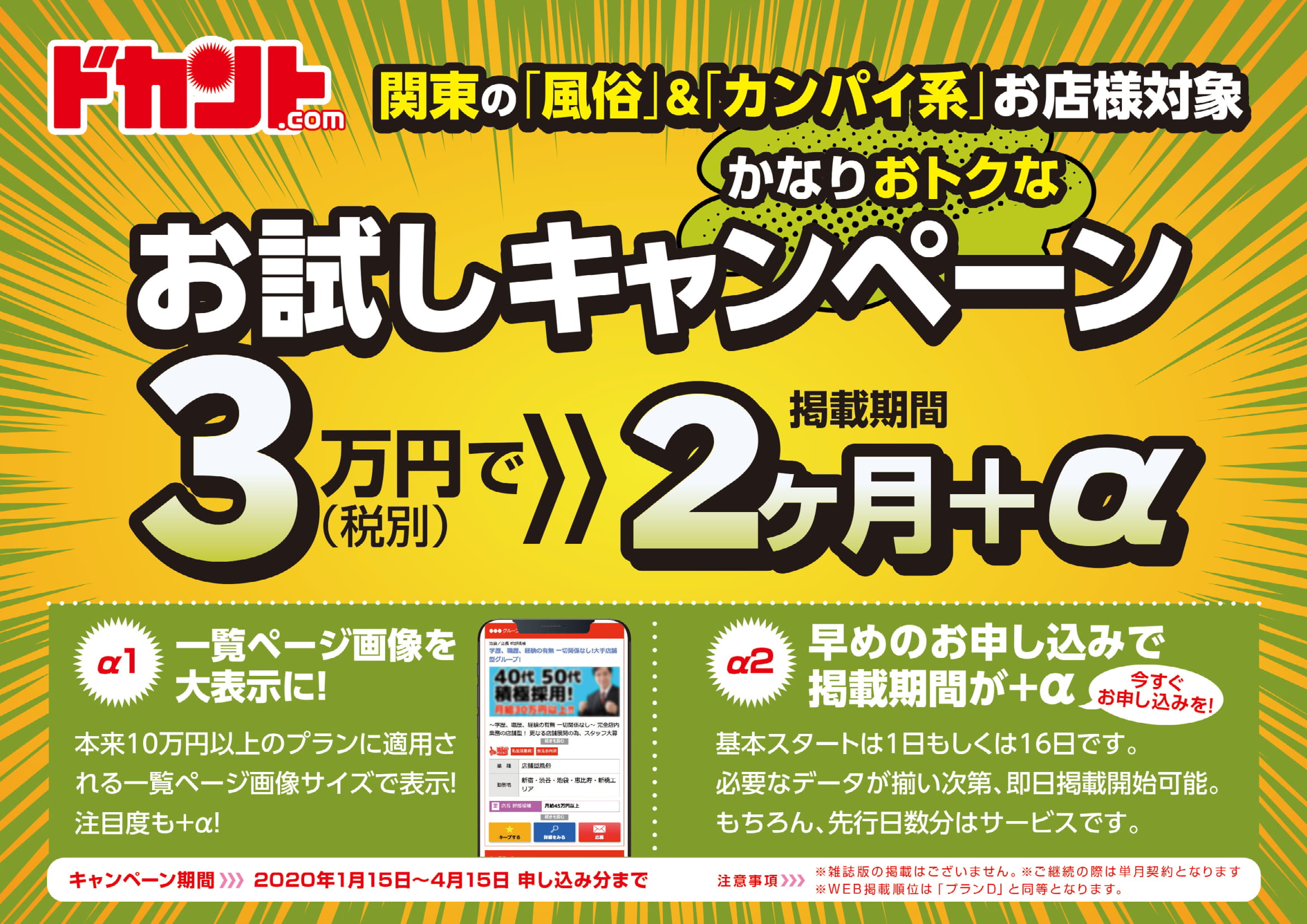 正社員やバイト、店長・幹部候補などの雇用形態や、日払いや時給、副業OK、短期OKなどの希望条件から目的の求人情報がすぐ見つかるドカントより、「風俗系」&「カンパイ系」の店舗様限定で2ヶ月30,000円でご掲載できる【お試しキャンペーン】のお知らせです!