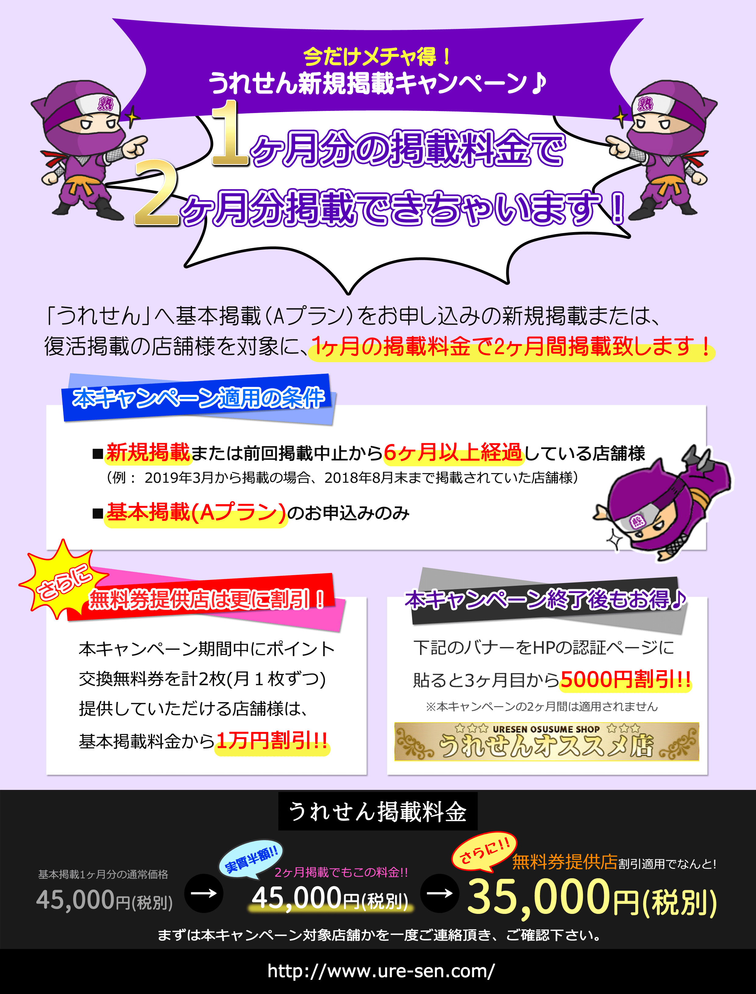 うれせんの基本掲載Aプランをお申込みの店舗様は、1ヶ月料金で初回2ヶ月掲載が可能となります!