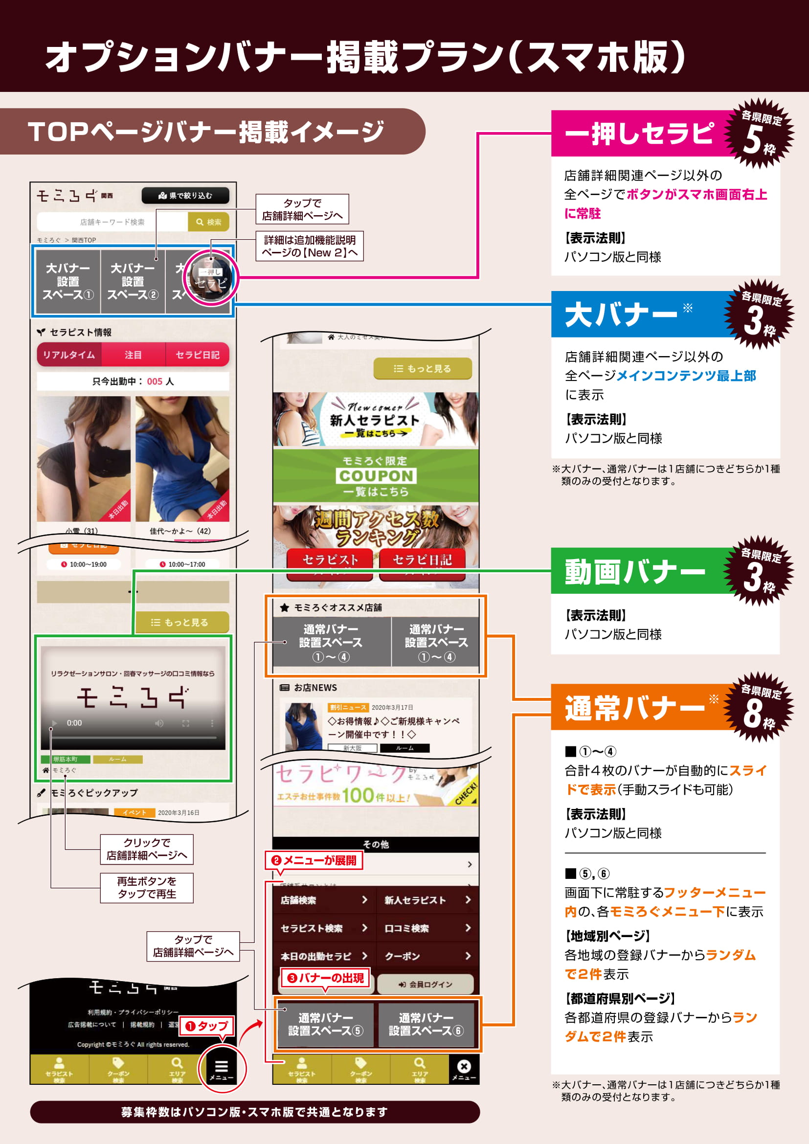 | オプション | [各県限定8枠]通常バナー | [各県限定3枠]大バナー | [各県限定3枠]動画バナー | [各県限定5枠]一押しセラピスト |