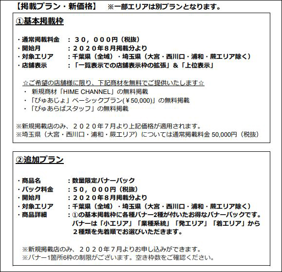 2020年7月より、千葉県(全域)・埼玉県(大宮・西川口・浦和・蕨エリア除く)の新規お申し込み店舗様は、30,000円でのご掲載へと変更となります!現在ご掲載中の既存店様は、2020年8月より新価格適用となりますので下記、ご確認をお願いいたします。