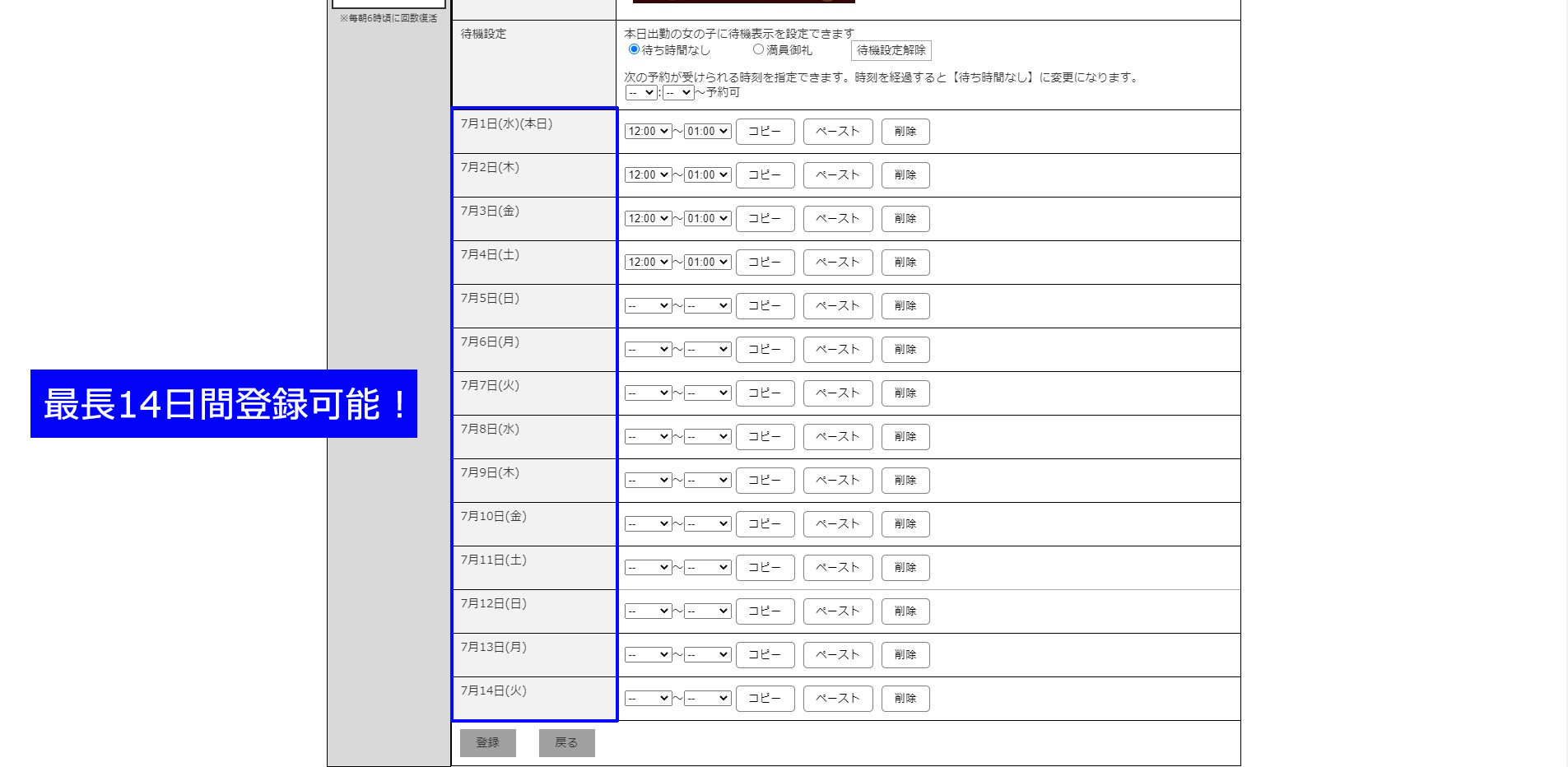 今まで出勤登録では7日間でしたが、最大14日間まで登録可能になりました。
