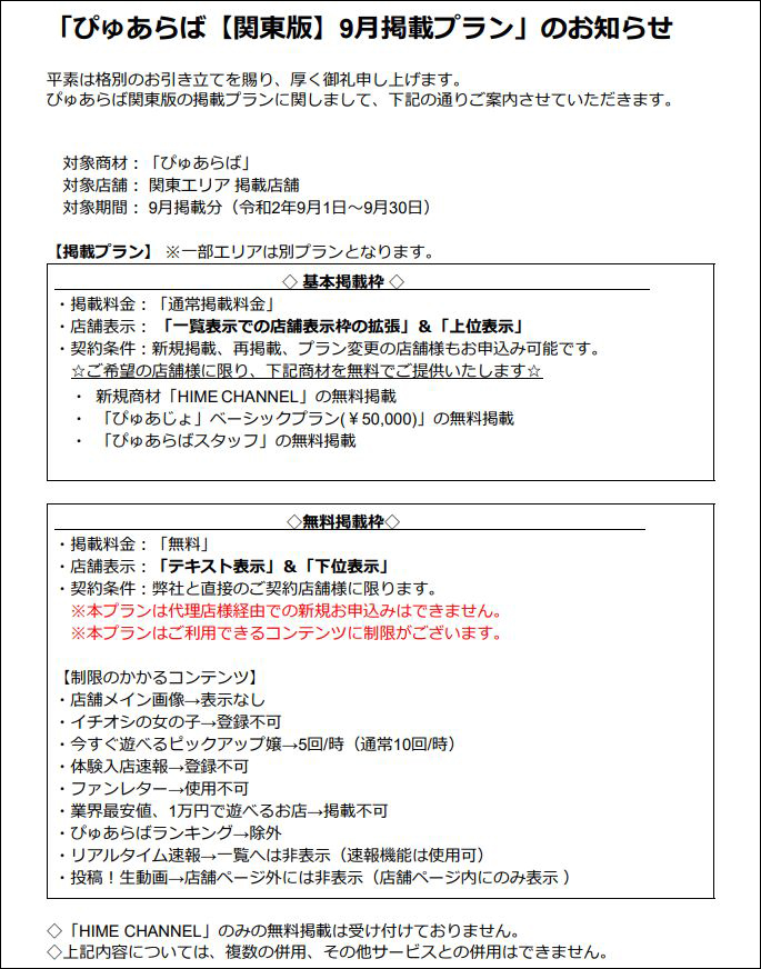 新商材「HIME CHANNEL」、ぴゅあじょのベーシックプラン、ぴゅあらばスタッフ求人の無料で掲載サービスいたします。リンク設置等特に条件はございません。