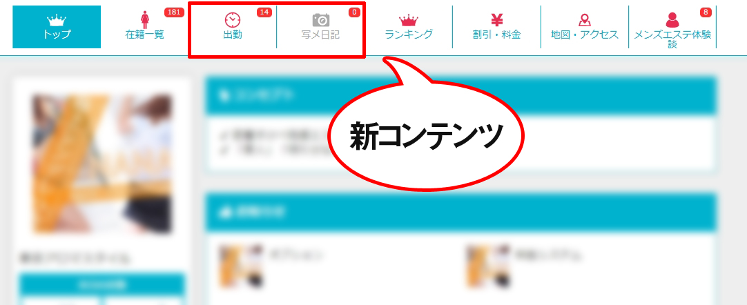 リニューアルにより、新しく「出勤情報」「写メ日記」のコンテンツが追加となりました。