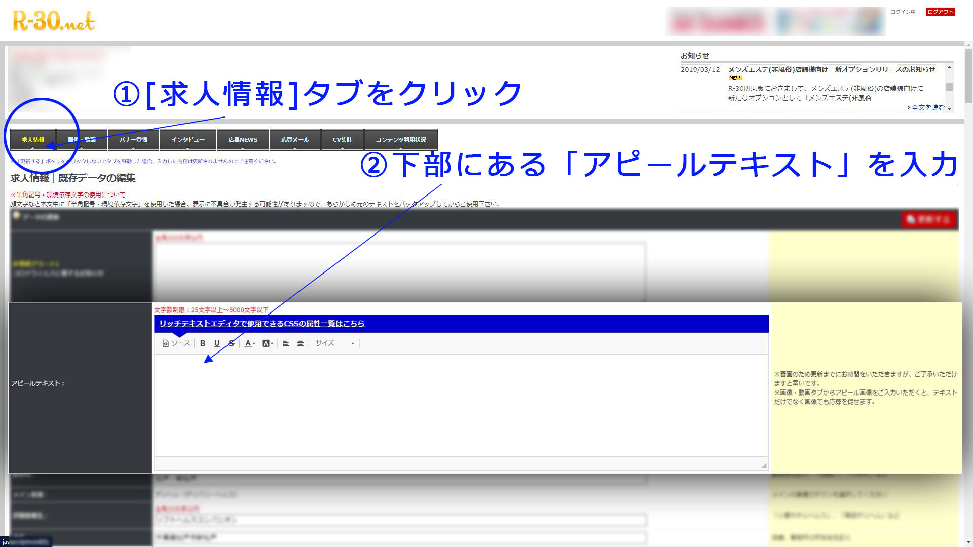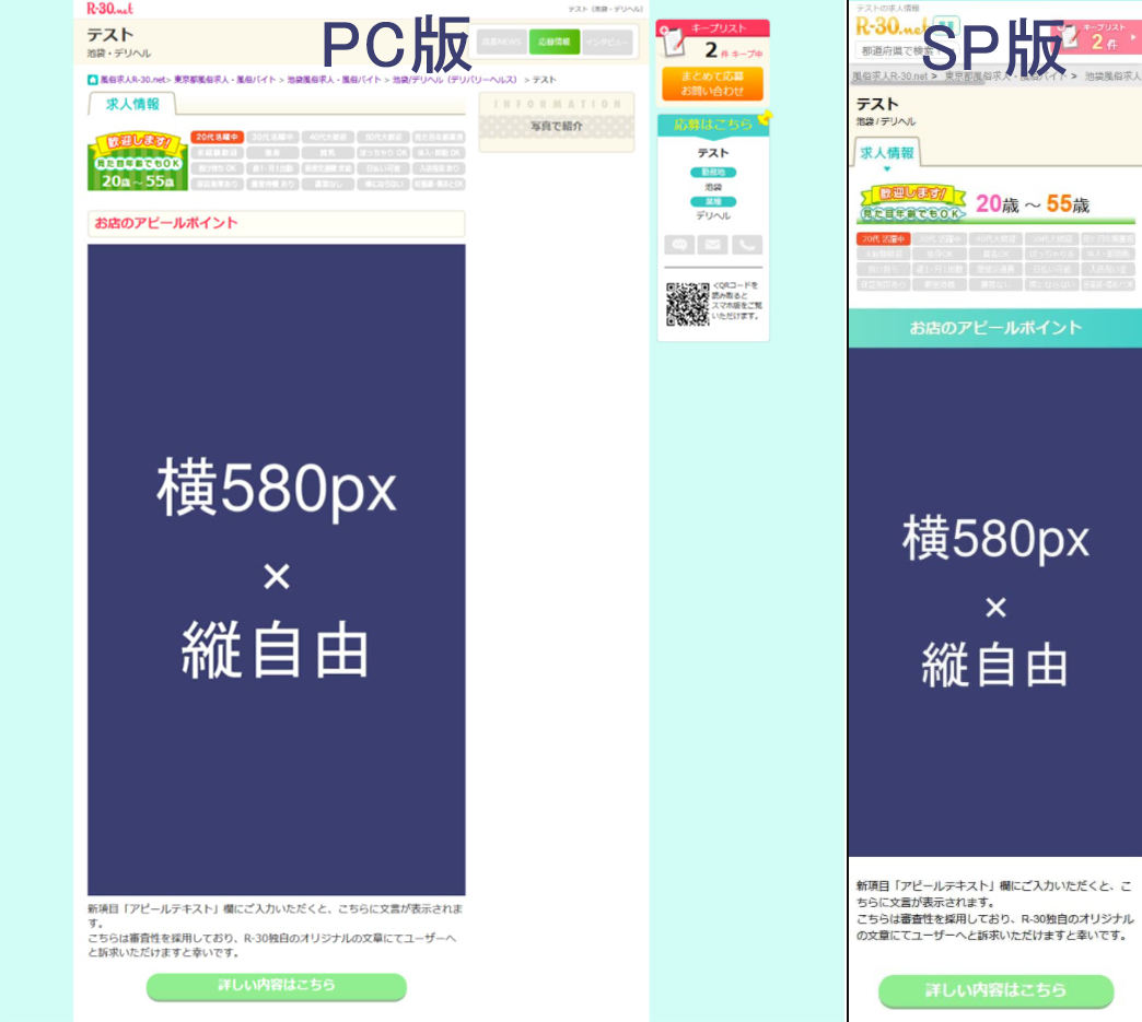 様々なジャンルの風俗求人を紹介しており、20代~40代までの幅広い年齢層の女性から応募が期待できる「R-30」より、「アピール画像」・「アピールテキスト」欄追加!! 既存項目の変更のお知らせです!!