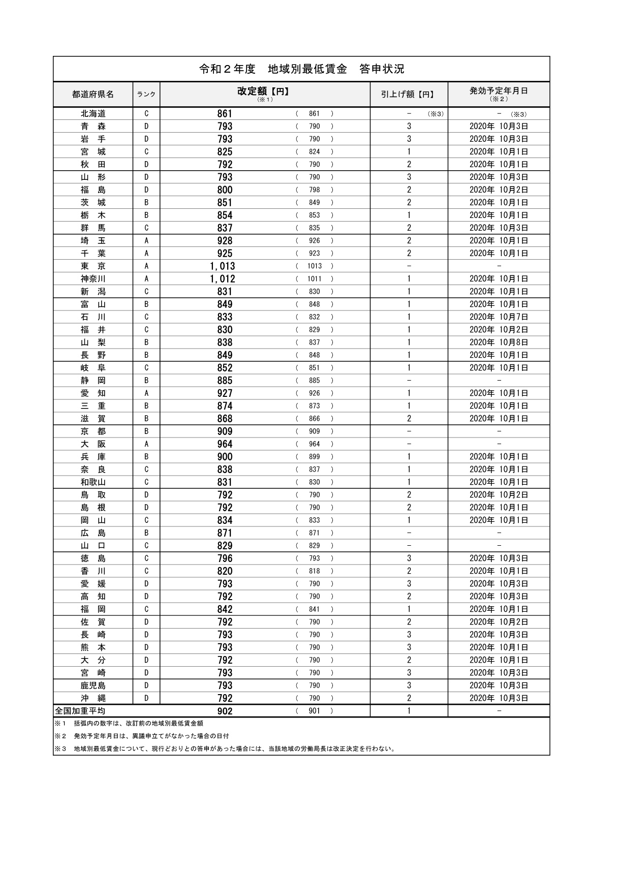令和2年10月より都道府県の最低賃金(最低時給)が改定することとなりました。