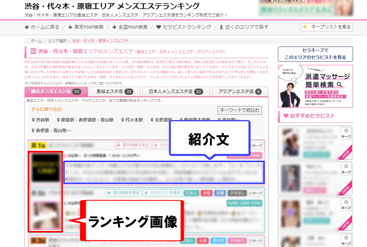 全国のメンズエステ店をランキング形式で紹介しているメンズエステ店専門の人気老舗集客サイト「全国メンズエステランキング」♪SEOが非常に強いのでメンズエステでの掲載を迷った際は第一候補で掲載をご検討することを強くオススメします!サイト内に表示されるランキングは、アクセス数などを全国メンズエステランキング独自の視点で評価し、常に最新のランキングが更新され掲載されてます。ご契約するプランによってはランキングページでの掲載だけでなく、ユーザーに1番見られるサイトのTOPページで店舗バナーを設置することができちゃうんです!ランキングアップで反響もアップ!店舗ランキングアップのコツはよくある質問にてご確認ください♪