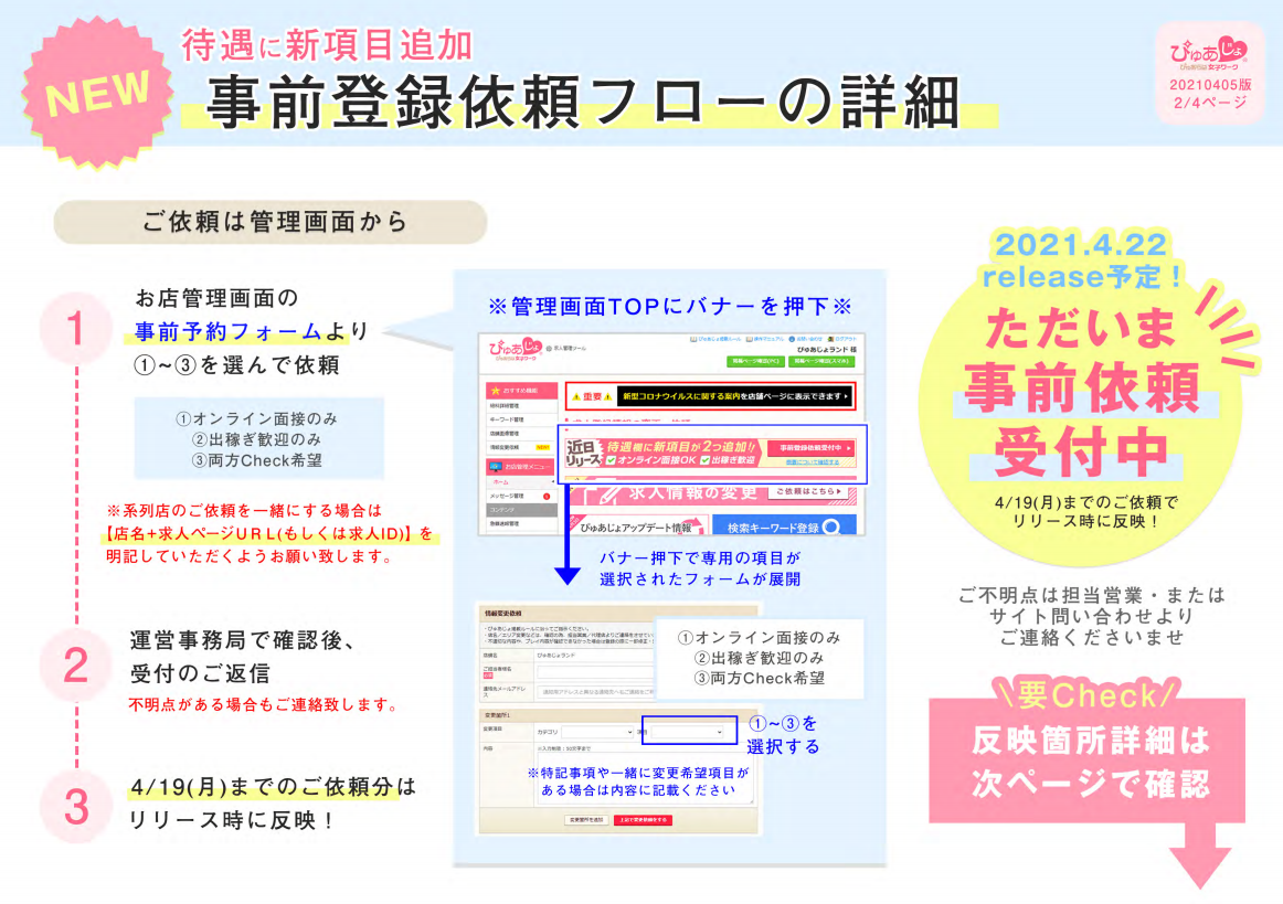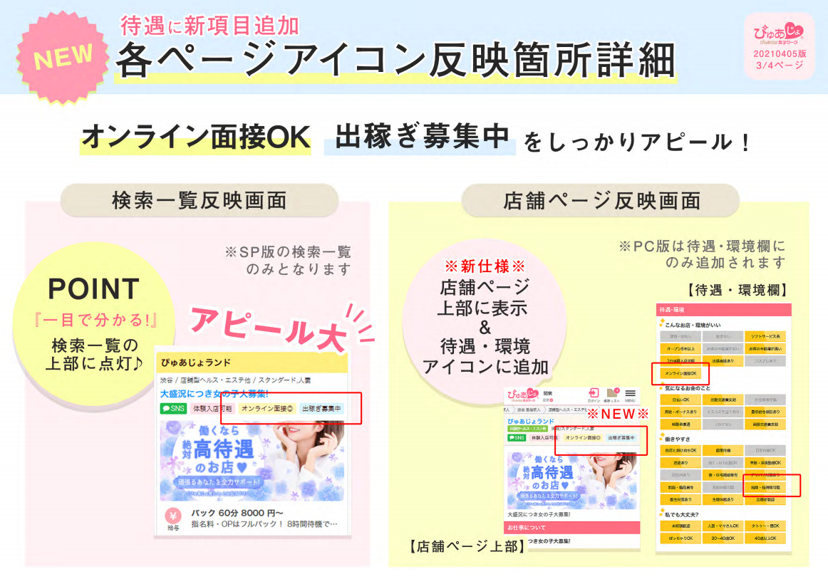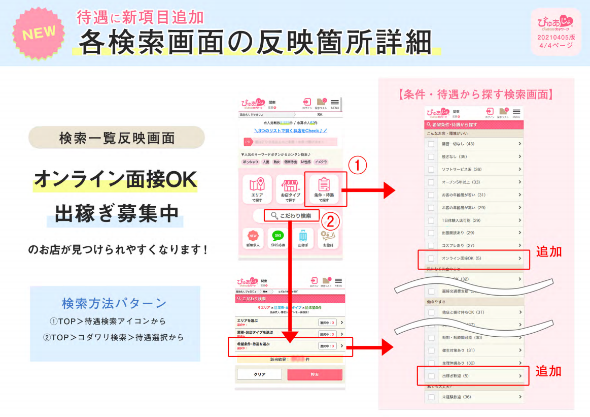 2021年4月22日(木)に待遇に「オンライン面接OK」「出稼ぎ歓迎」の2つの項目追加を行うこととなりました。2021年4月5日(月)より店舗様から事前受付が出来るようフォームを設置し対応させていただきます。