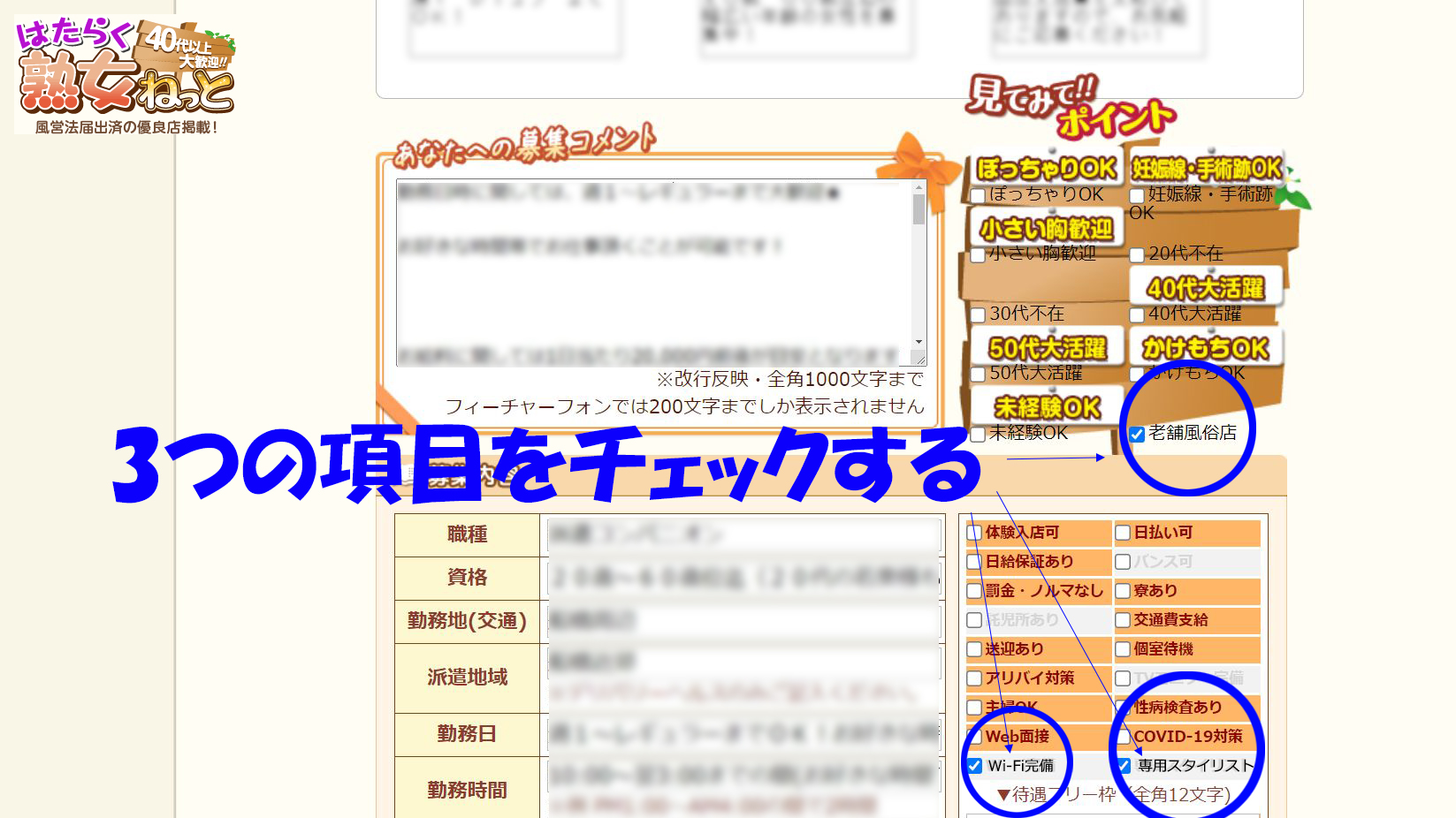 有料掲載の店舗様のみ、管理画面から[店舗詳細ページ]内、[見てみてポイント]のチェック覧に「老舗風俗店」が追加