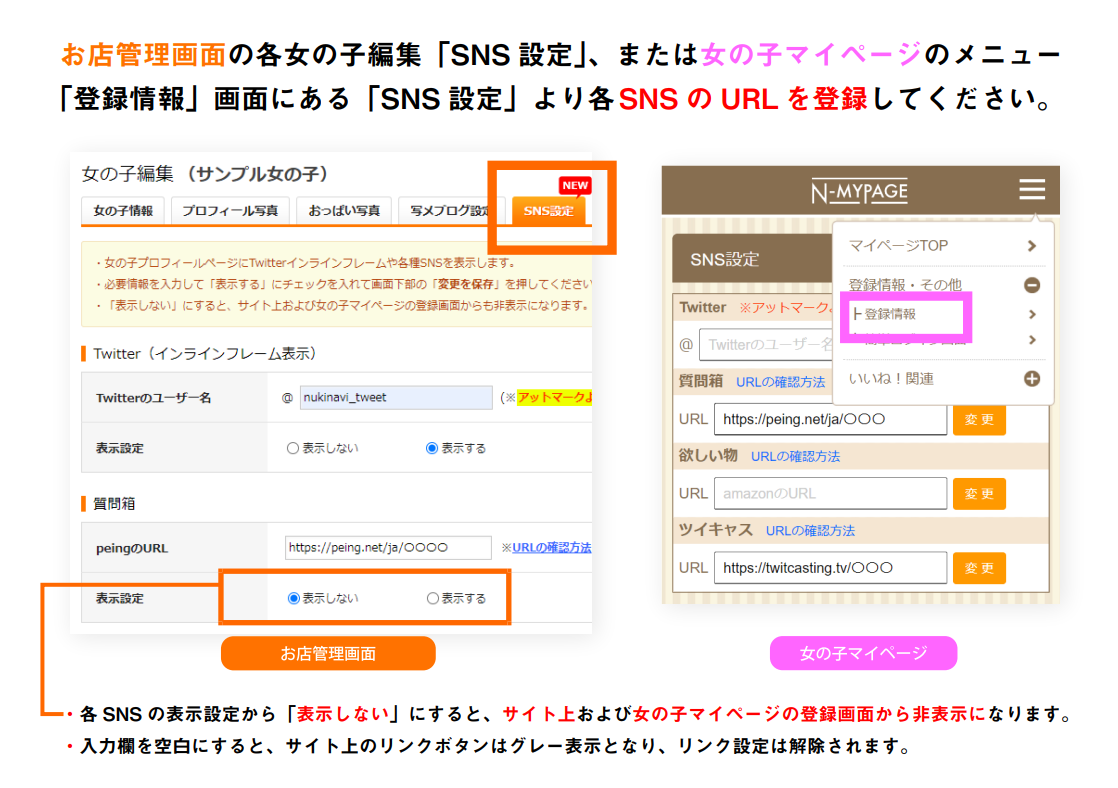 お店管理画面の各女の子編集「SNS設定」、もしくは女の子マイページの登録情報 画面下部「SNS設定」より、各SNSのURLを登録してください。