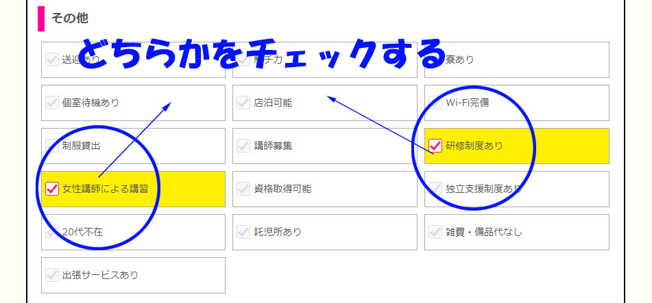 店舗管理画面内の「研修制度あり・女性講師による講習」のどちらかにチェックすることで、こちらのページに表示されるようになります。
