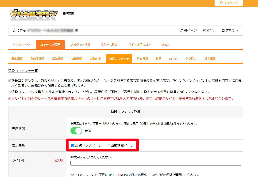 ※「店舗トップページ」と「出勤情報ページ」の両方にチェックをした場合、両ページに表示されます。