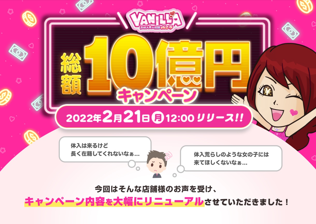 【バニラ】入店&継続ボーナス「総額10億円プレゼント企画」のお知らせ