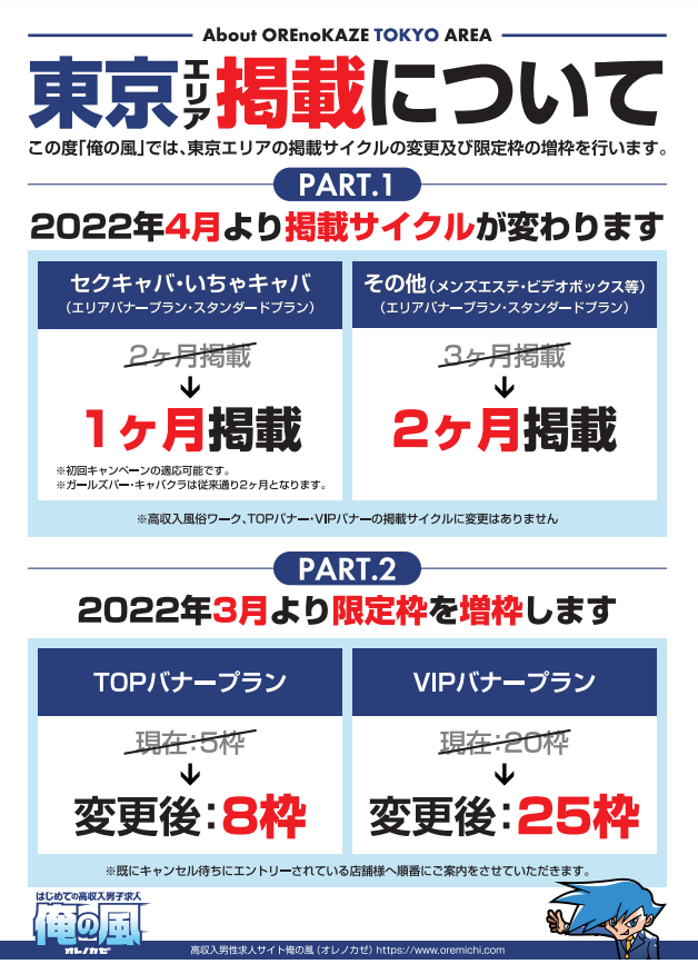 未経験歓迎や学歴不問で稼げるお仕事情報満載!高収入求人サイト!「俺の風」より掲載サイクルの変更及び積極採用オプションリリース、限定枠の増枠のお知らせです!