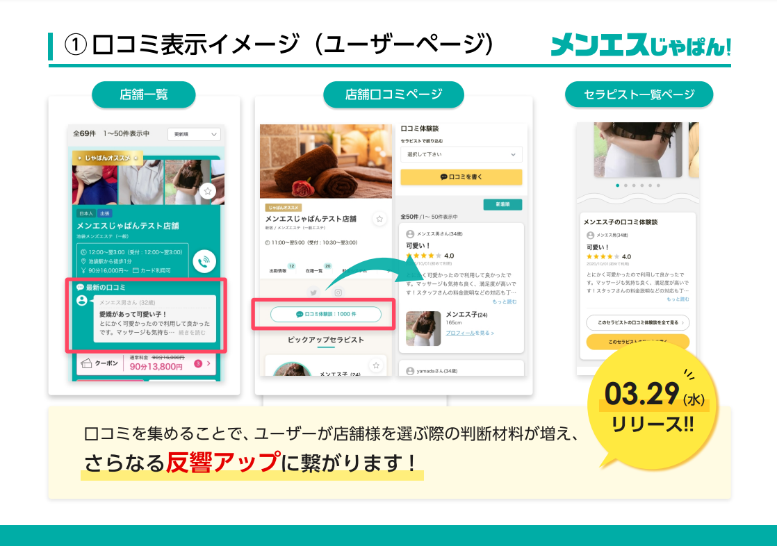 メンエスじゃぱんより、新コンテンツ『口コミ機能』リリースのお知らせです!