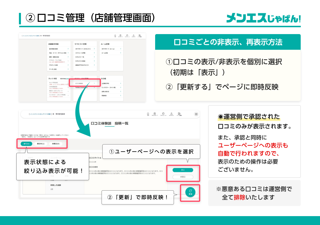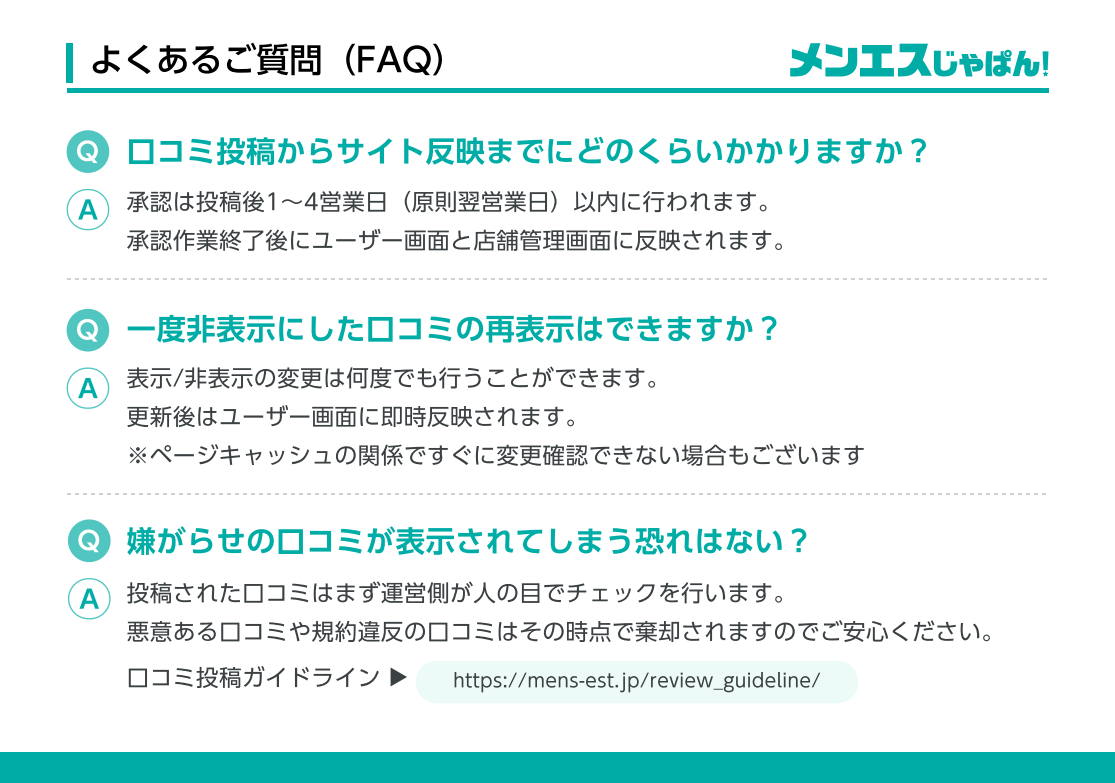 お店を利用したユーザーさんが口コミを投稿できる機能です!ユーザーから投稿された口コミはメンエスじゃぱんサイト内各ページに表示される他、店舗管理画面よりユーザーページへの表示、非表示等の管理ができます。