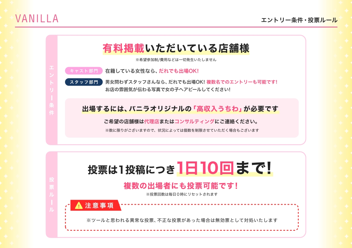 └キャスト部門:在籍している女性なら、だれでも出場OK!(1店舗あたりの参加人数の上限はございません。)