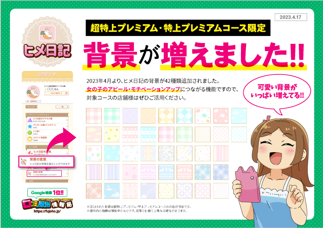 全国の風俗、デリヘルの口コミ掲載数NO.1の「口コミ風俗情報局」より『ヒメ日記』の背景追加のお知らせ!