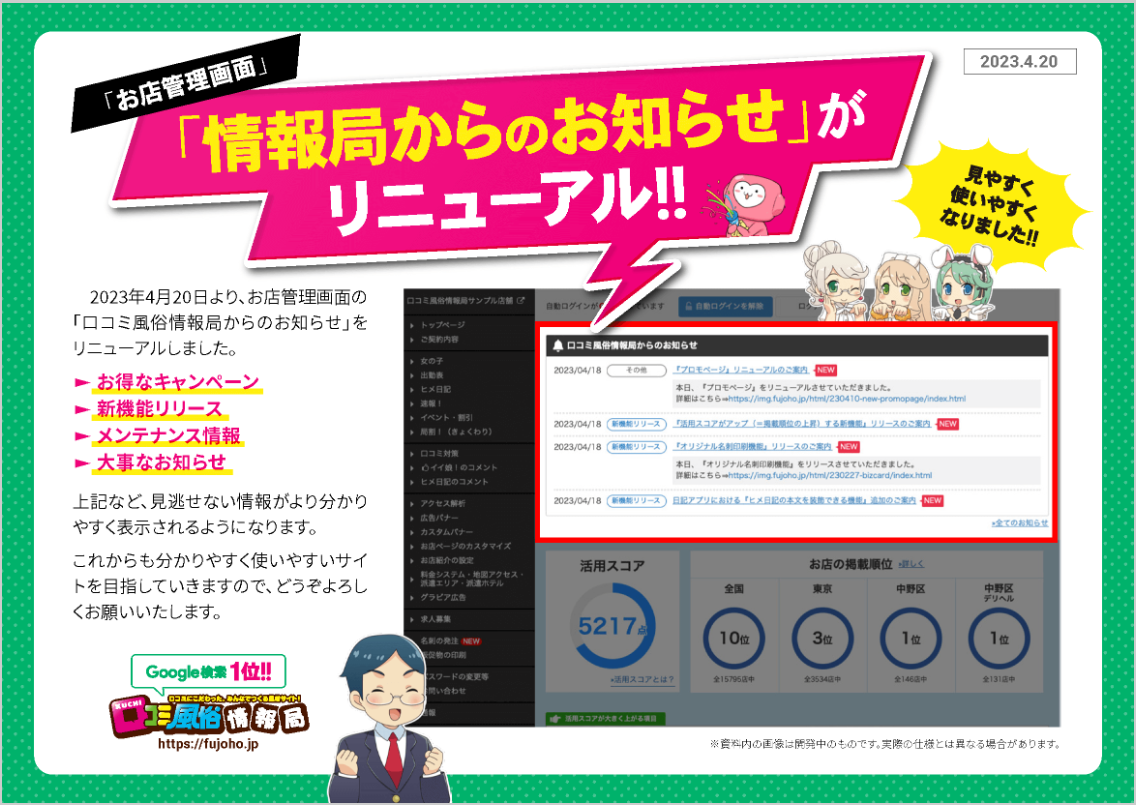 全国の風俗、デリヘルの口コミ掲載数NO.1の「口コミ風俗情報局」より管理画面内『お知らせ』のリニューアルについて!