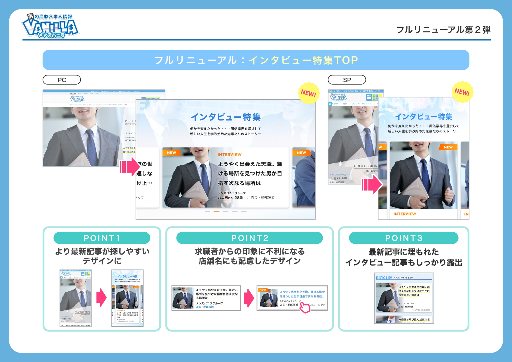「業界未経験者」「店舗スタッフ」の応募者をさらに獲得していく為にメンズバニラではサイトの全面改修を行っています。