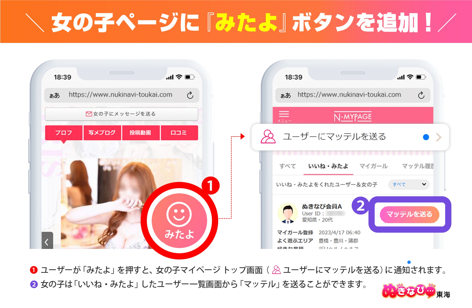 ユーザーが「みたよ」ボタンを押すと女の子のマイページに通知され、女の子は気になるユーザーに「マッテル」を送信できます。